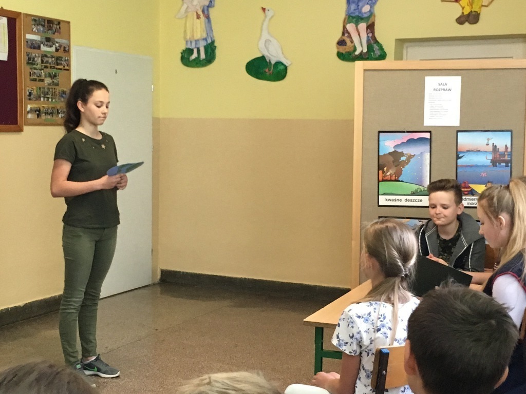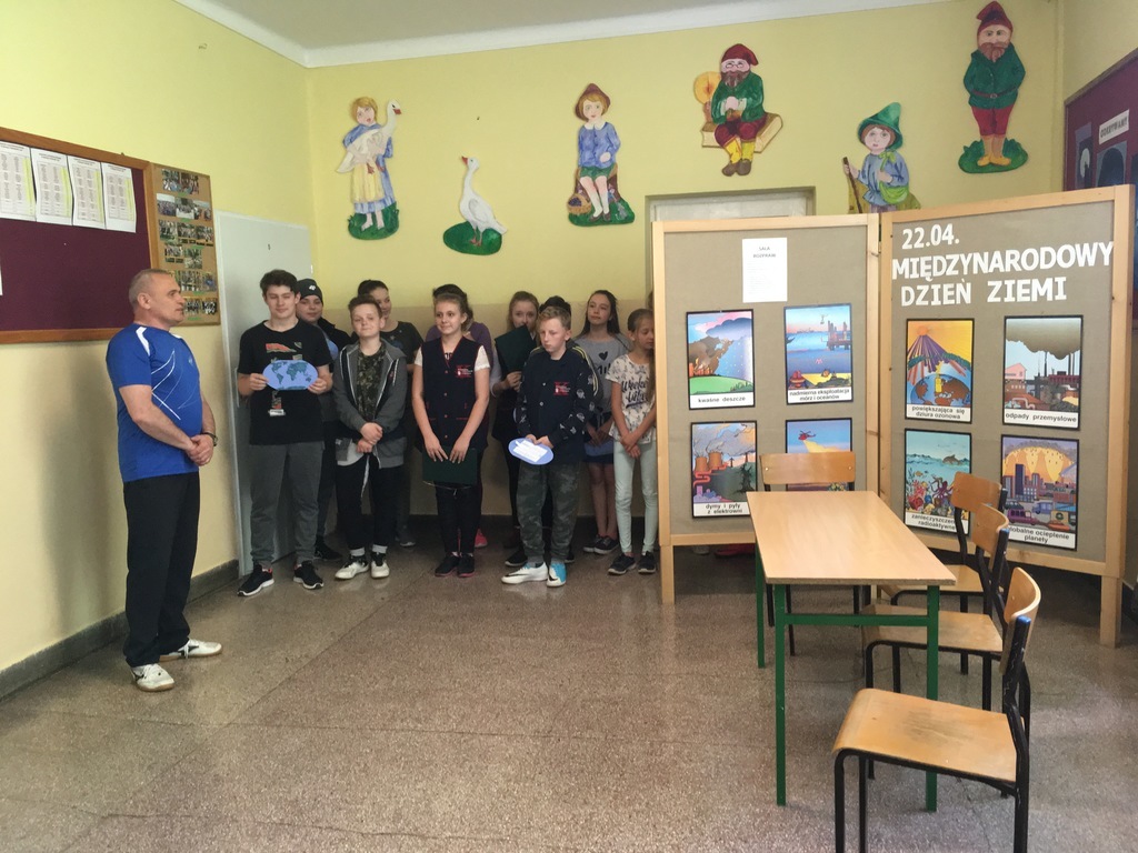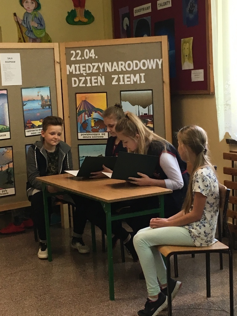 25 kwietnia uczniowie klasy VII zaprezentowali uroczystą akademię z okazji Dnia Ziemi. Przedstawienie w formie rozprawy sądowej, uzmysłowiło wszystkim, jak ważna jest ochrona naszej planety przed degradacją środowiska naturalnego. Kwaśne deszcze, globalne ocieplenie, smog, śmieci zalegające rzeki i lasy przyczyniają się do niszczenia Ziemi. Tylko mądre, ekologiczne postępowanie wszystkich ludzi może to zmienić.