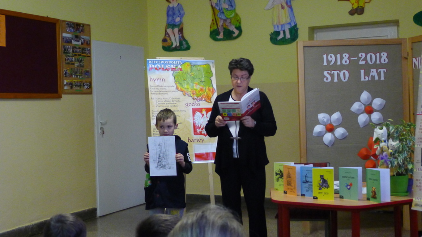 26 listopada uczniowie naszej szkoły mieli okazję spotkać się z autorką wierszy i opowiadań dla dzieci. Pani Stanisława Błach pochodzi z Rzeszowa i przyjechała do nas, aby zaprezentować swoje utwory. Autorka chętnie opowiadała o swojej twórczości. Dowiedzieliśmy się, że książeczkę pt. "Święto Niepodległości" napisała z okazji 100-lecia odzyskania przez Polskę niepodległości. Utwór wprowadza dzieci w świat historii naszej małej ojczyzny - miasta Rzeszowa. Treść zapisaną wierszem dopełniają realistyczne ilustracje miejsc pamięci narodowej na starówce Rzeszowa. Z tą książką można wybrać się na spacer w towarzystwie rodziców lub dziadków. Na pamiątkę tego spotkania otrzymaliśmy ilustracje z autografem pisarki.