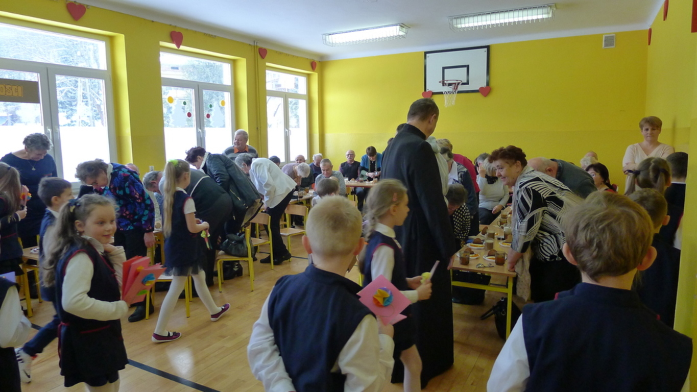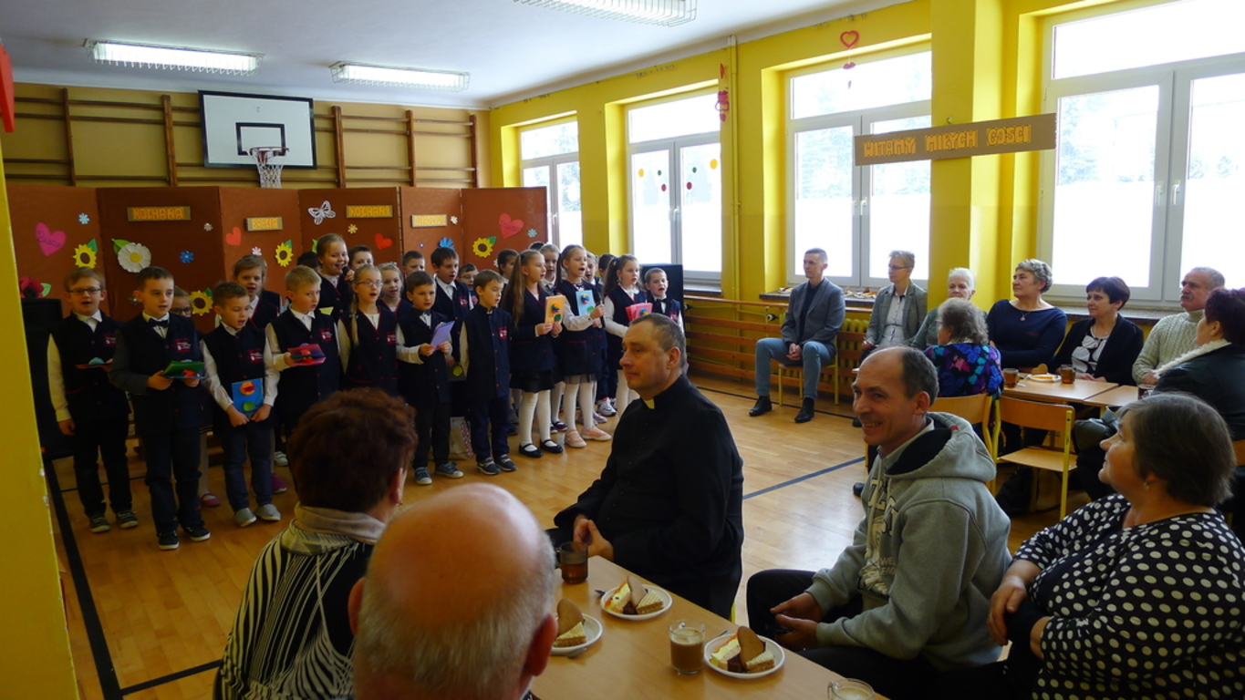 25 stycznia, w piękny piątkowy dzień, gdy na dworze śnieg zdobił drogi, drzewa i wszystko wokół, w naszej szkole było wyjątkowo. Salę gimnastyczną zapełnili najserdeczniejsi na świecie goście - dostojni Dziadkowie i przepiękne Babcie. Zaprosiliśmy ich, aby uczcić ich święto - Dzień Babci i Dzień Dziadka. Klasy I, II i III przygotowały występ artystyczny. Nie zabrakło wierszy, piosenek, kolęd i pastorałek, a także laurek z życzeniami i słodkiego poczęstunku.
