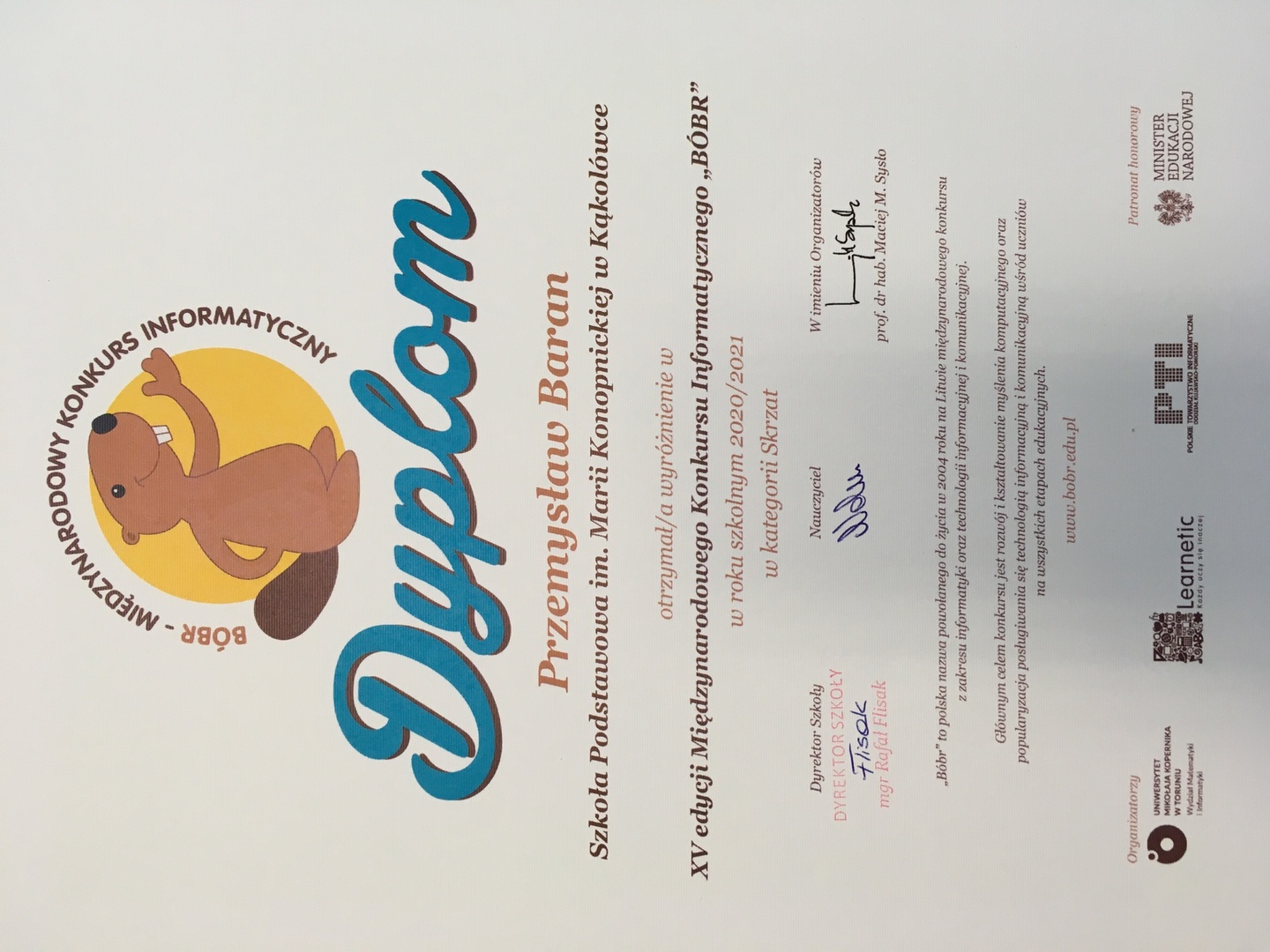 W listopadzie 2020 r. 14 uczniów naszej szkoły wzięło udział w Międzynarodowym Konkursie Informatycznym "Bóbr". Wyniki konkursu ogłoszono dopiero teraz - w styczniu 2021 r.