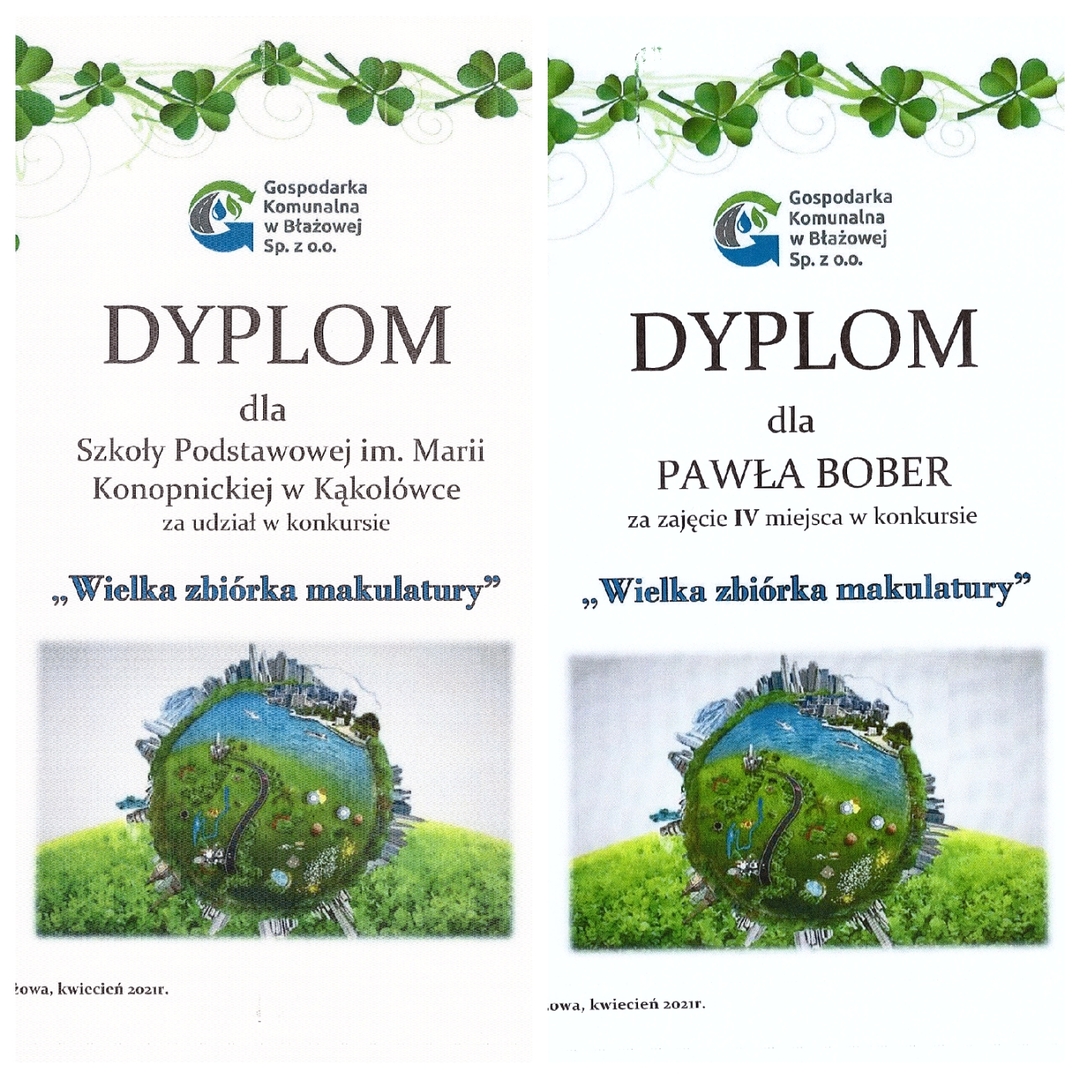 Wielka zbiórka makulatury to konkurs organizowany przez Gospodarkę Komunalną w Błażowej. W tym roku udział w nim wzięli nasi uczniowie z klas 1-3. Miło nam ponformować, że IV miejsce w tym konkursie uzyskał Paweł Bober (klasa 1).
