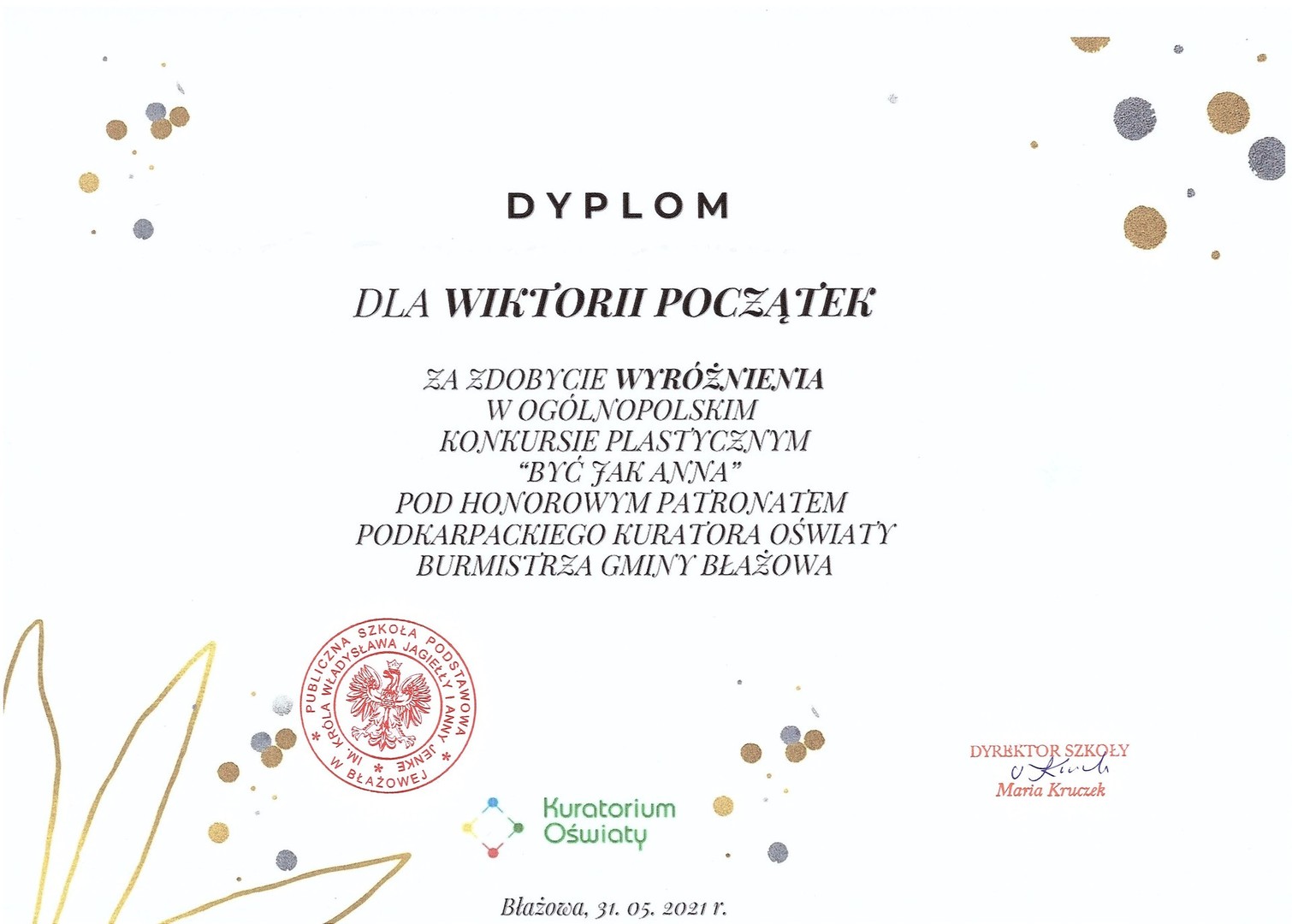 Miło nam poinformować, że nasza uczennica Wiktoria Początek (kl.7) otrzymała wyróżnienie w Ogólnopolskim Konursie Plastycznym "Być jak Anna" zorganizowanym pod honorowym patronatem Podkarpackiego Kuratora Oświaty i Burmistrza Gminy Błażowa.