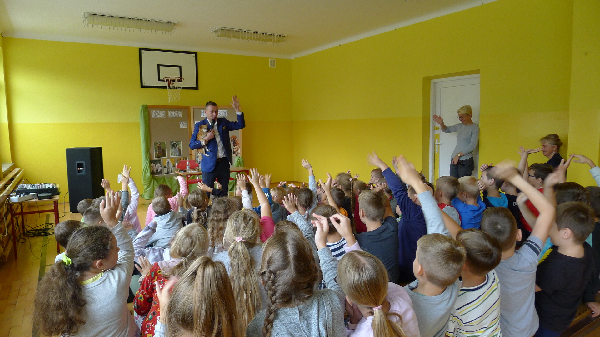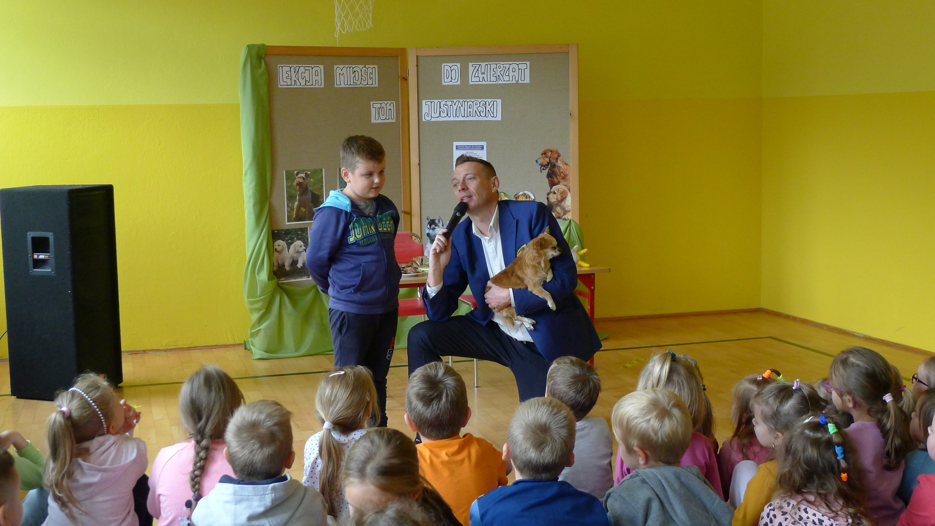 Naszą szkołę odwiedził dzisiaj pan Tom Justyniarski. Nie przyjechał sam, bo towarzyszyła mu Lusia, którą zaadoptował ze schroniska.