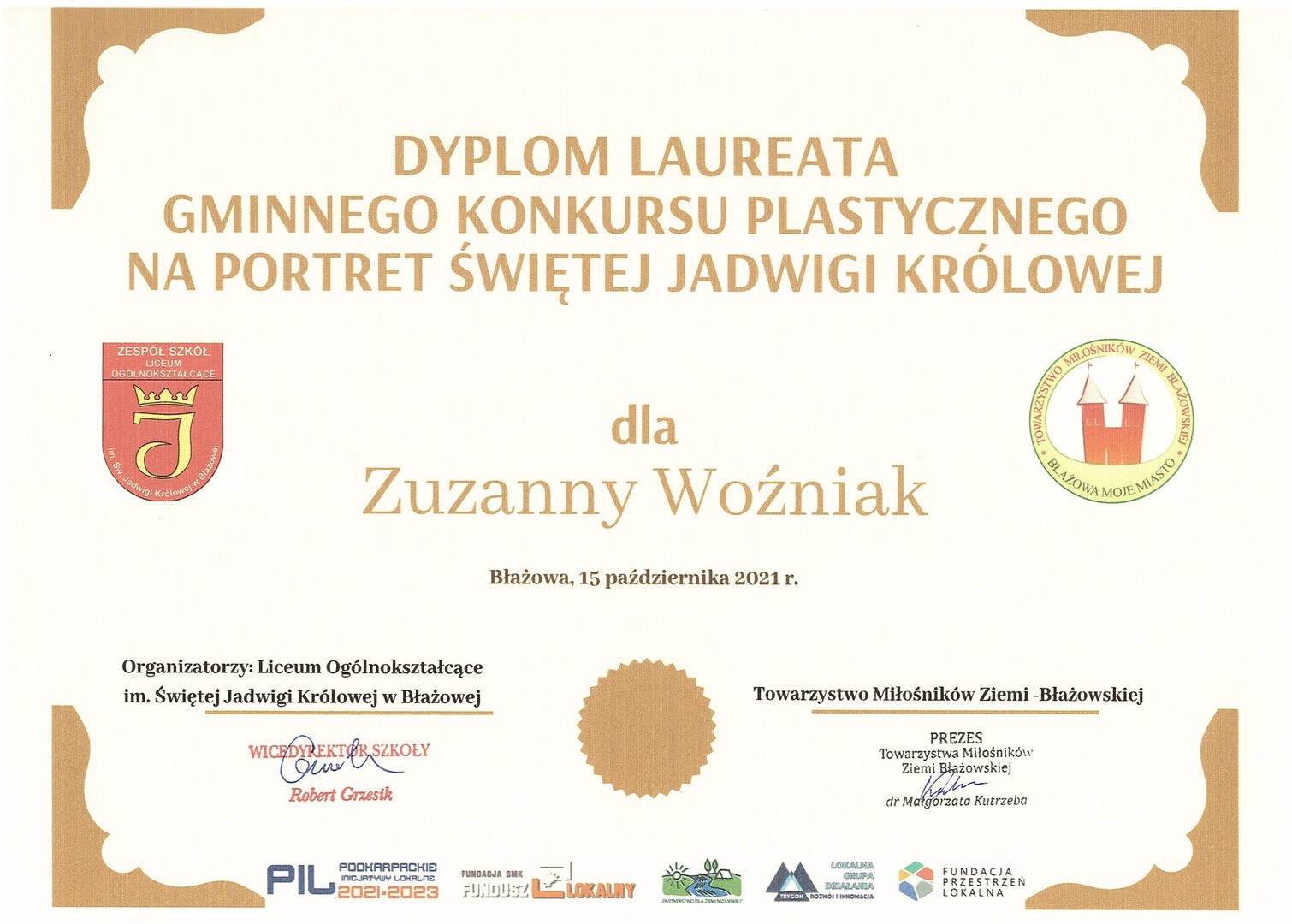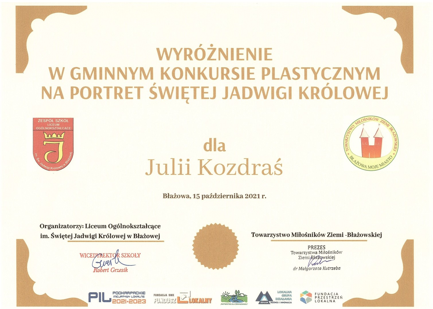 Miło nam poinformować, że nasze uczennice Zuzanna Woźniak (kl.7) i Julia Kozdraś (kl.7) zostały nagrodzone w Gminnym konkursie plastycznym na portret świętej Jadwigi Królowej zorganizowanym przez Liceum Ogólnokształcące w Błażowej.