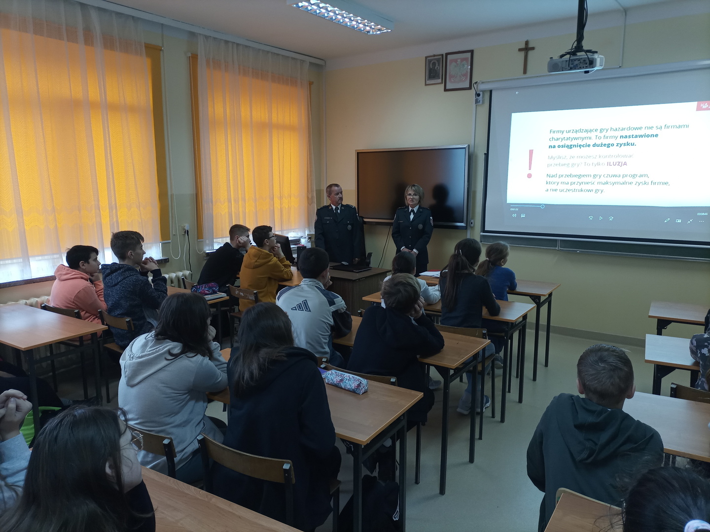 W dniu 23.11.2021 r. nasi uczniowie klas 7-8 uczestniczyli w zajęciach prowadzonych w ramach akcji edukacyjnej „Hazard? Nie daj się wciągnąć!”. Zajęcia prowadzili st. asp. Izabella Kołeczek-Woszczyna i asp. Zdzisław Czernecki z Podkarpackiego Urzędu Celno-Skarbowego w Przemyślu.