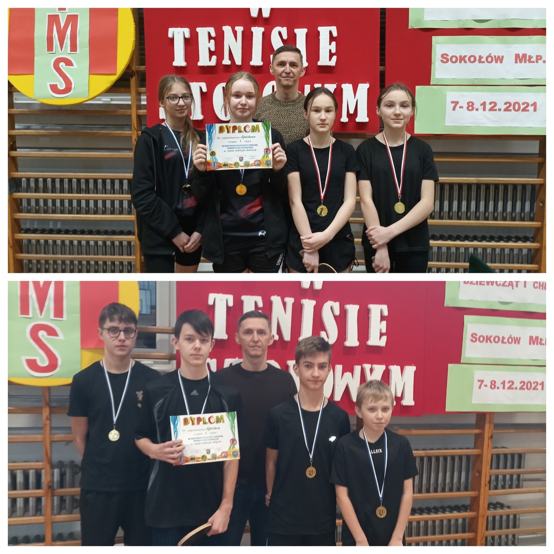 W rozgrywanych w dniach 7-8 grudnia 2021 r. zawodach powiatowych w drużynowym tenisie stołowym Igrzysk Młodzieży Szkolnej (kl.7-8) obie nasze reprezentacje zdobyły złote medale.
