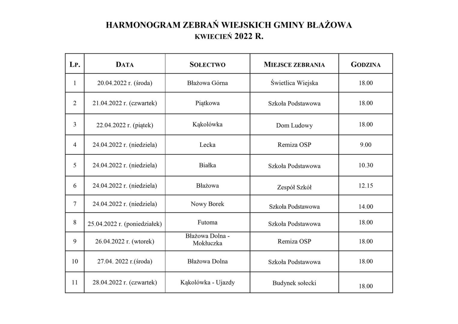 Na prośbę Urzędu Miejskiego w Błażowej zamieszczamy harmonogram zebrań wiejskich Gminy Błażowa.