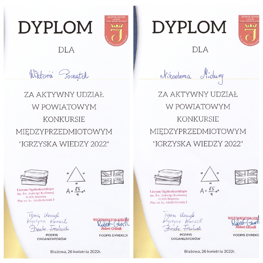 26 kwietnia 2022 r. w Liceum Ogólnokształcącym w Błążowej odbył się finał Powiatowego Konkursu Międzyprzedmiotowego „Igrzyska wiedzy 2022” pod patronatem Starosty Rzeszowskiego. W konkursie wzięło udział 30 najlepszych uczniów ze 120 zgłoszonych w etapie szkolnym z 10 szkół Powiatu Rzeszowskiego.