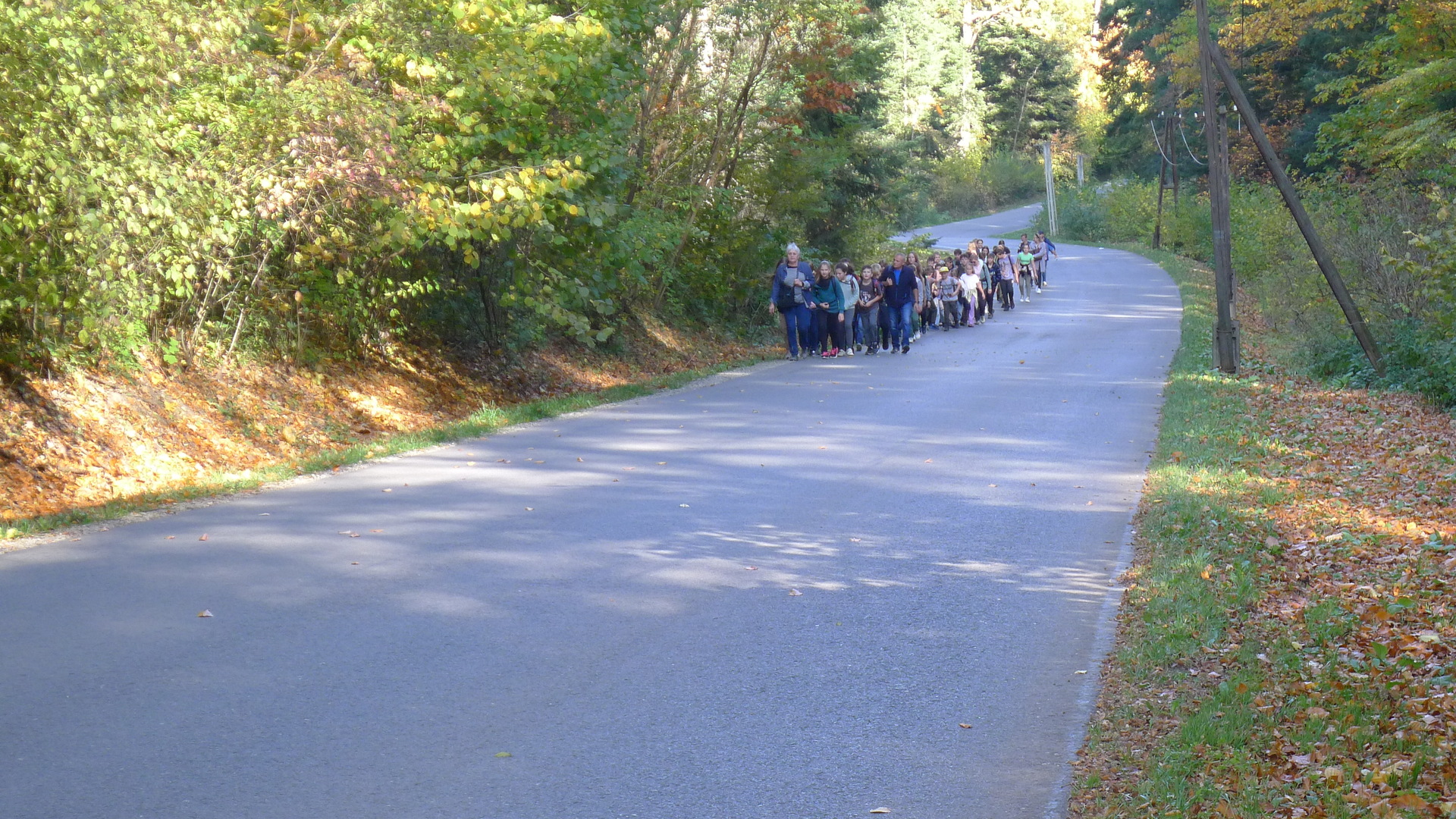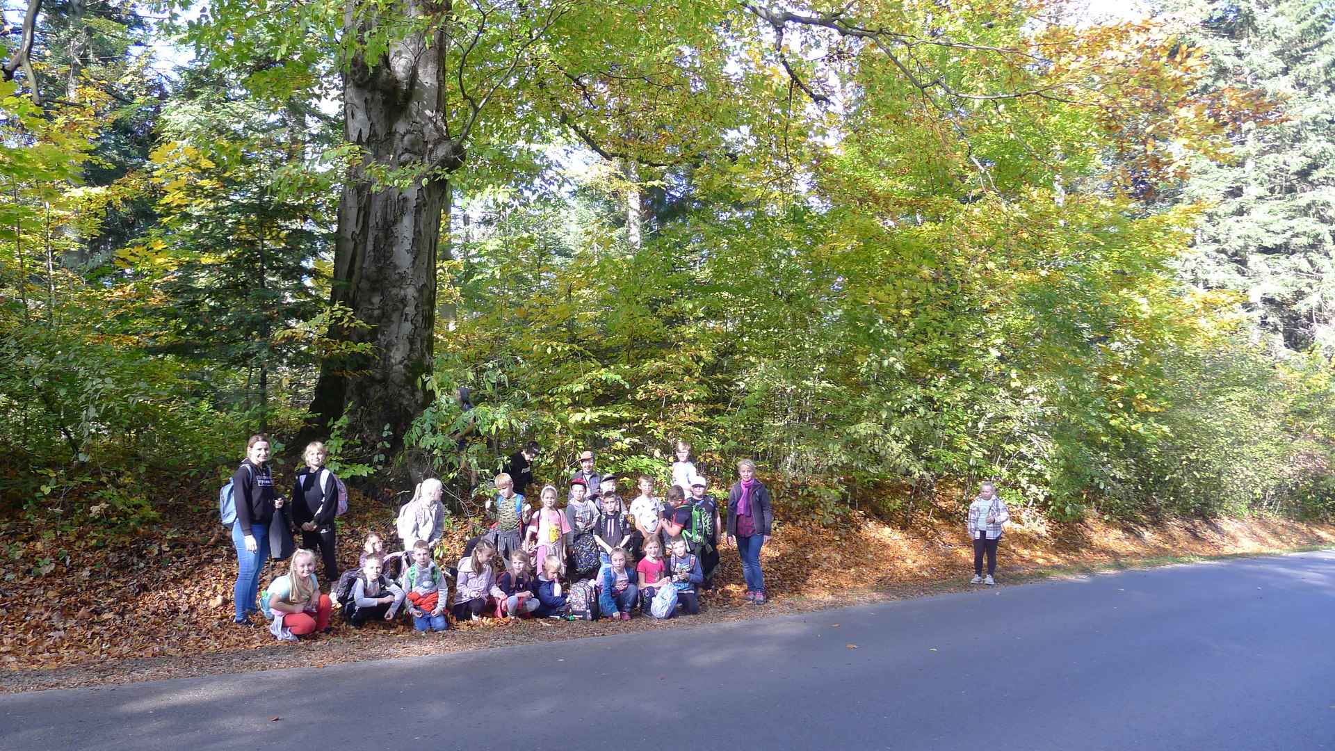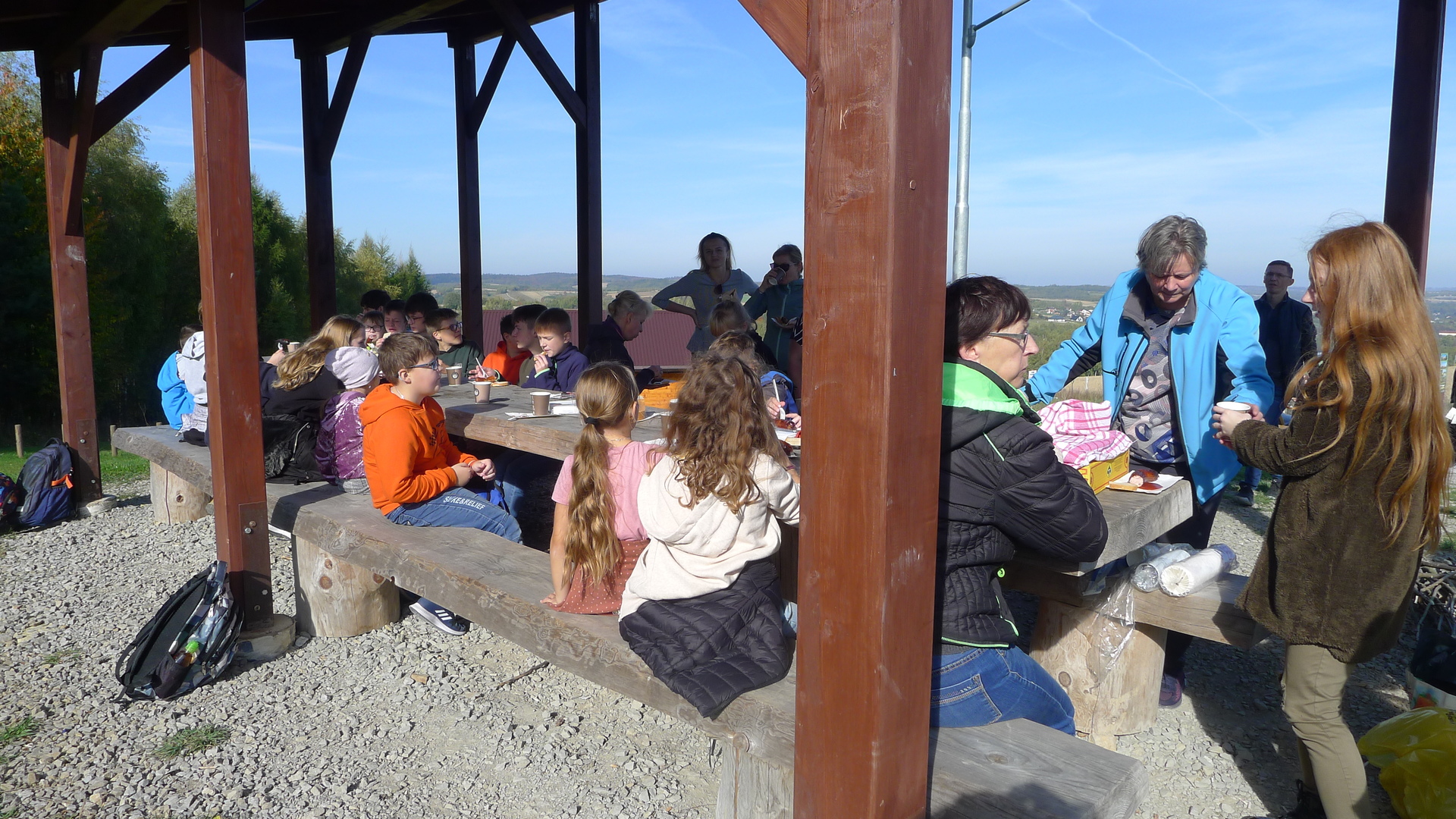 17 października nasi uczniowie wybrali się na wycieczkę pieszą. Celem było zdobycie punktu widokowego w Kąkolówce. Po drodze podziwialiśmy piękne krajobrazy przybrane w jesienne szaty. Był też postój i pamiątkowe zdjęcia pod bukiem Miłoszem, zbieranie liści, szyszek i żołędzi. Po dotarciu do celu uczniowie zajadali się pieczonymi kiełbskami, które przygotowały panie z kuchni. Nikt jednak nie myślał o odpoczynku, wokół było wiele atrakcji: tyrolka, huśtawki, siłownia na świeżym powietrzu, punkt widokowy z lornetką. Nie było czasu i miejsca na nudę. Pogoda również dopisała - było bardzo ciepło i słonecznie.