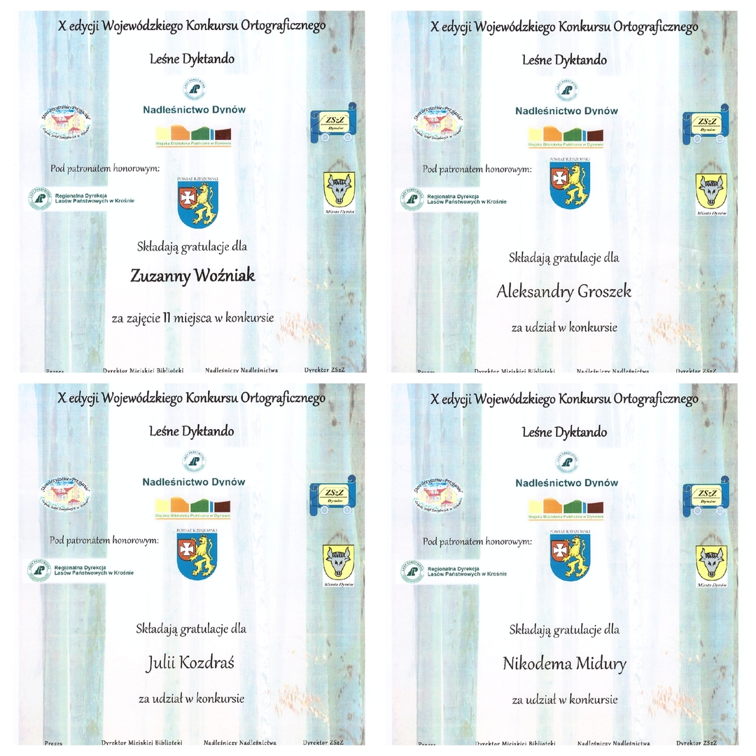 20.10.2022 r. w ZSZ w Dynowie odbyła się X edycja Wojewódzkiego Konkursu Ortograficznego ,,Leśne Dyktando", organizowanego przez Nadleśnictwo Dynów. W konkursie wzięło udział 86 uczniów, reprezentujących ponad 20 szkół podstawowych i ponadpodstawowych. Tekst dyktanda dotyczył historii dynowskich lasów. Naszą szkołę reprezentowali uczniowie klas siódmej i ósmej: Aleksandra Groszek, Zuzanna Woźniak, Julia Kozdraś i Nikodem Midura.
