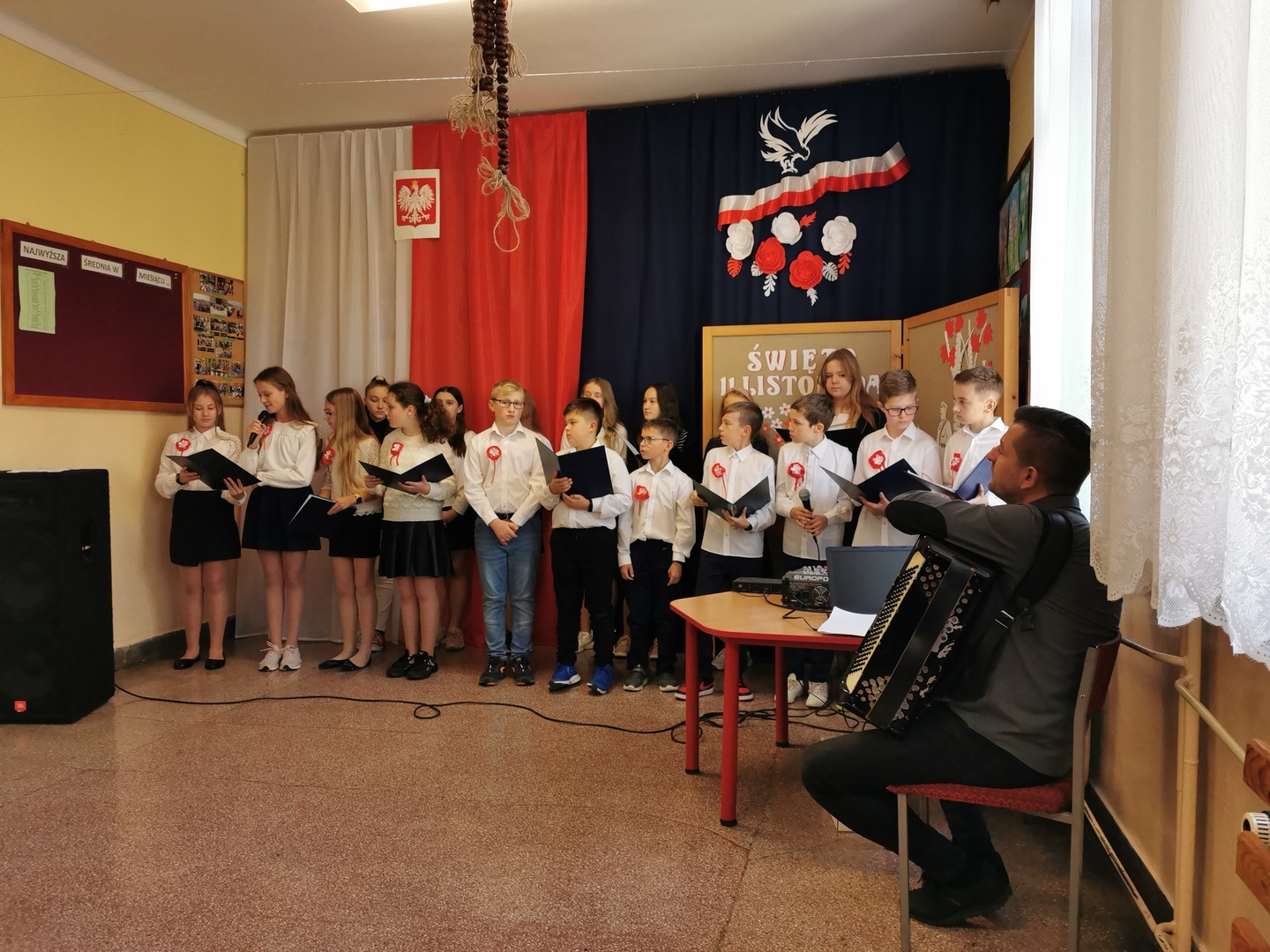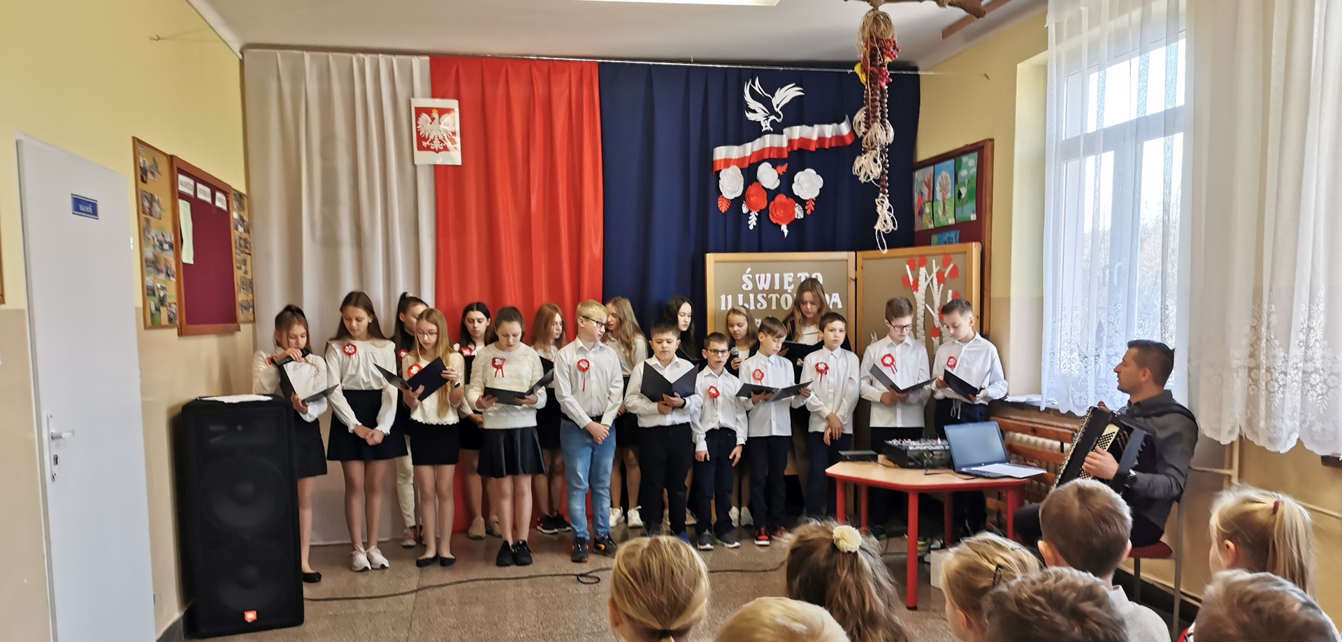 Aby uczcić Świeto Niepodległości uczniowie klas starszych przygotowali uroczysty apel. Przypomnieli bohaterską walkę naszych przodków o odzyskanie niepodległości oraz zaśpiewali patriotyczne pieśni sprzed lat.