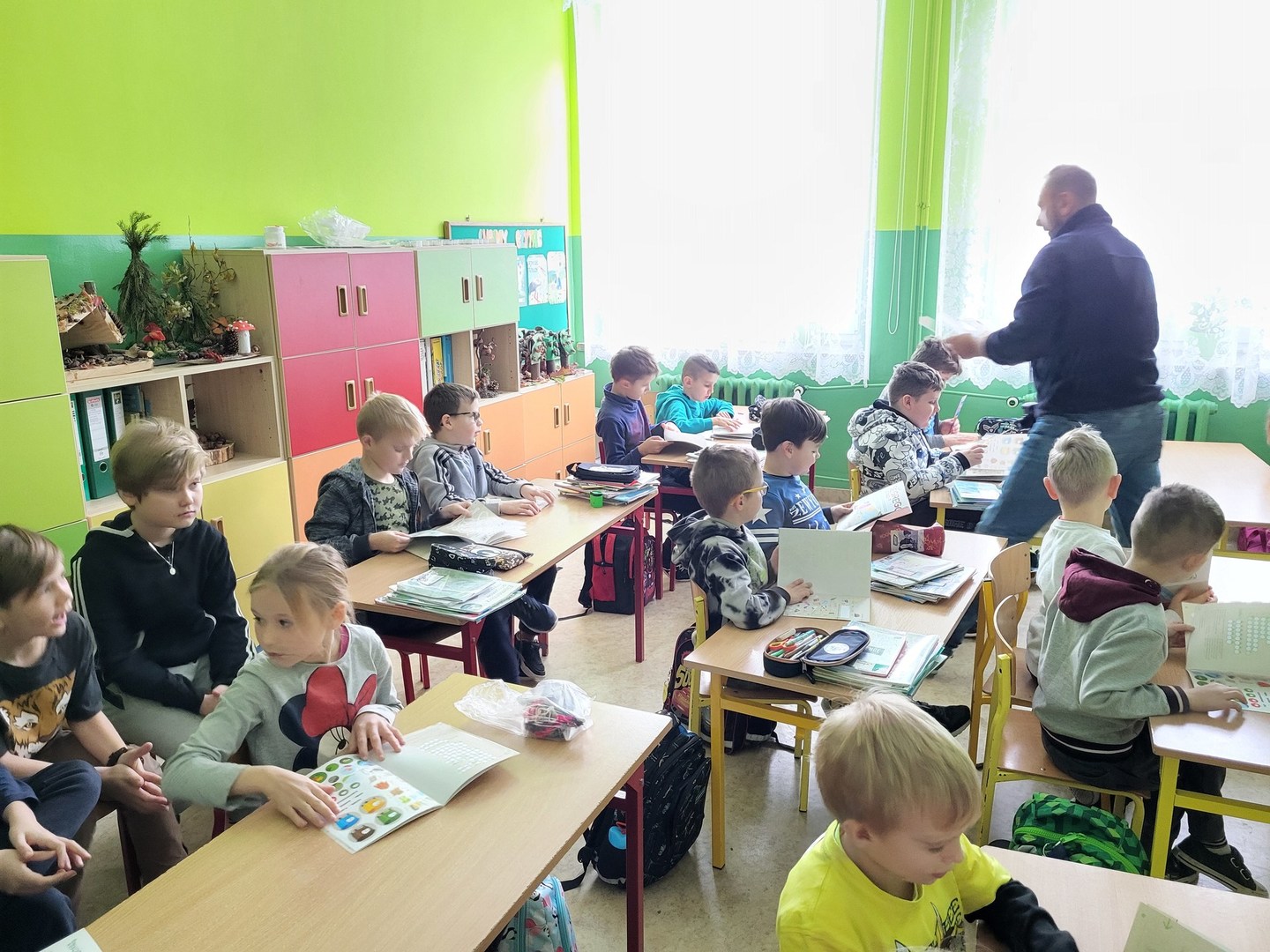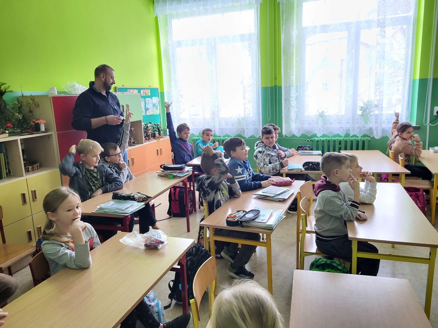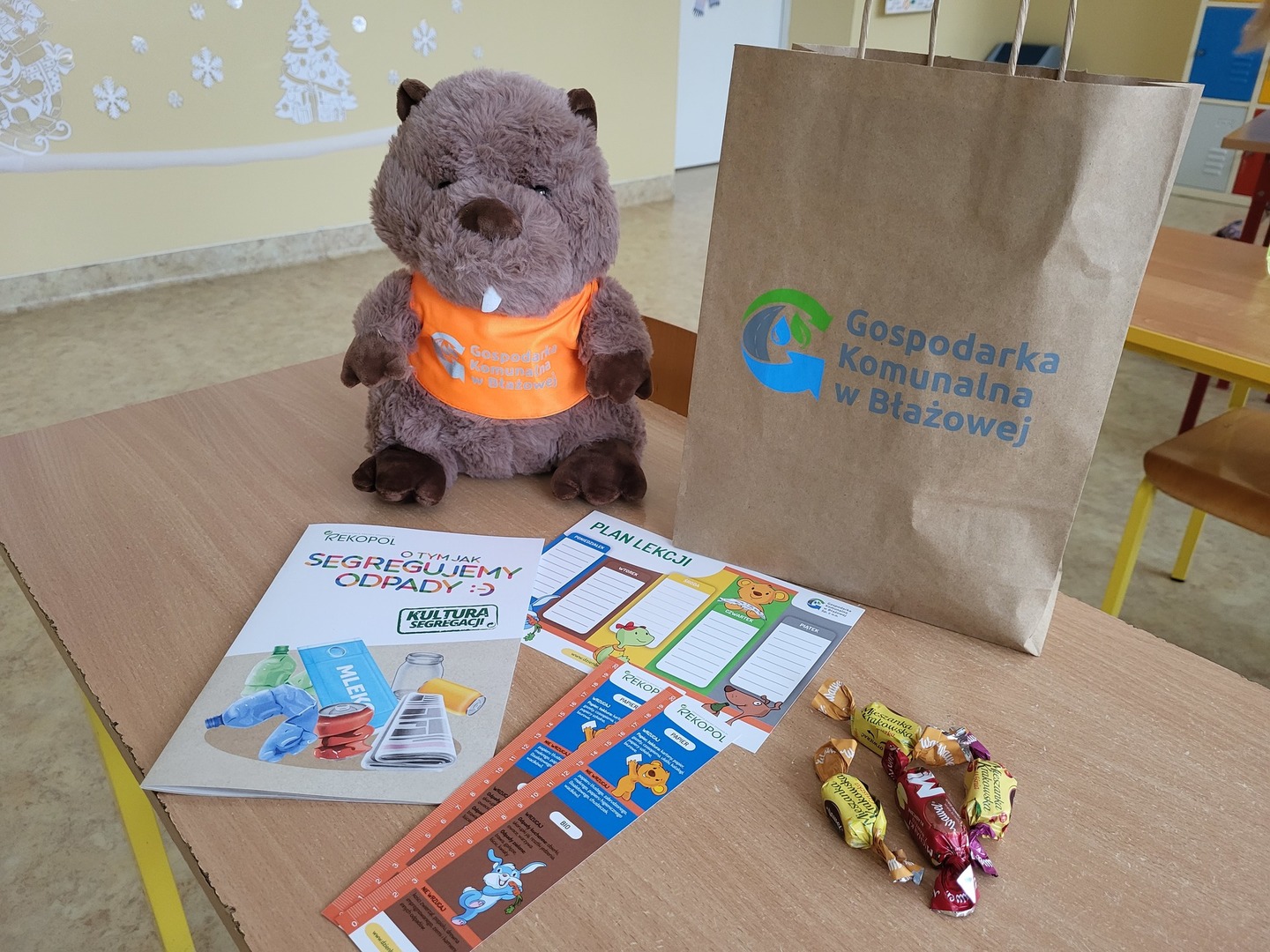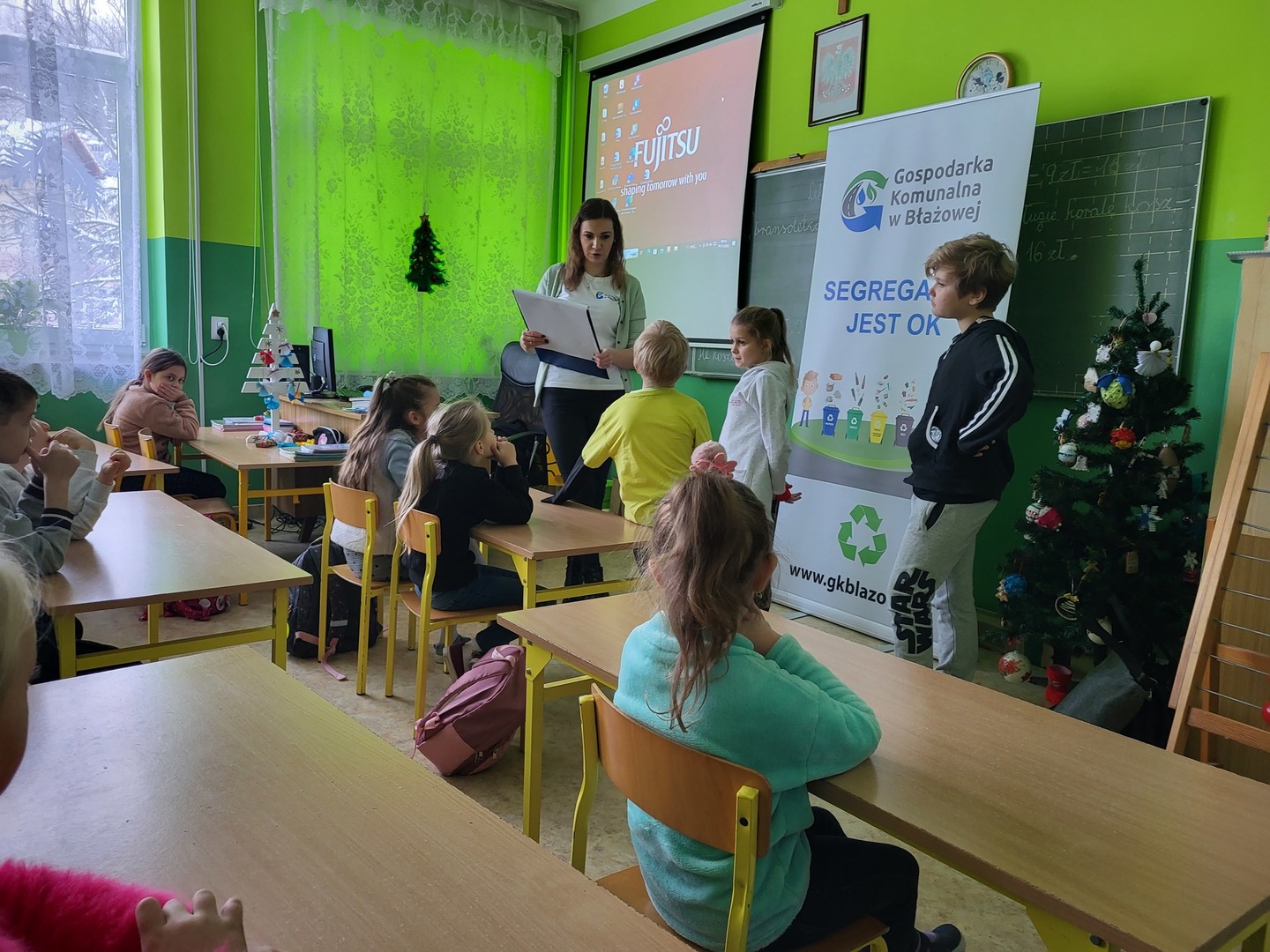 W środę, 14 grudnia naszą szkołę odwiedzili Państwo z Gospodarki Komunalnej w Błażowej, którzy przeprowadzili ekologiczną lekcję pełną ciekawych informacji i praktycznych porad dotyczących sortowania śmieci. Lekcja była skierowana do uczniów klas I-III, którzy dowiedziały się jak odpowiednio sortować śmieci, czym jest PSZOK, co to jest recykling i jaką drogę pokonuje plastikowa butelka po jej zużyciu, by posłużyć nam na nowo. Na koniec przedstawiciele każdej z klas wzięli udział w konkursie podsumowującym zdobytą wiedzę. Uczniowie świetnie poradzili sobie z niebanalnymi pytaniami i zdobyli dla każdej klasy urocze maskotki. Wszyscy uczestnicy ekologicznej lekcji otrzymali książeczki „O tym jak segregujemy odpady”, zakładkę do książki, plan lekcji oraz słodki upominek.