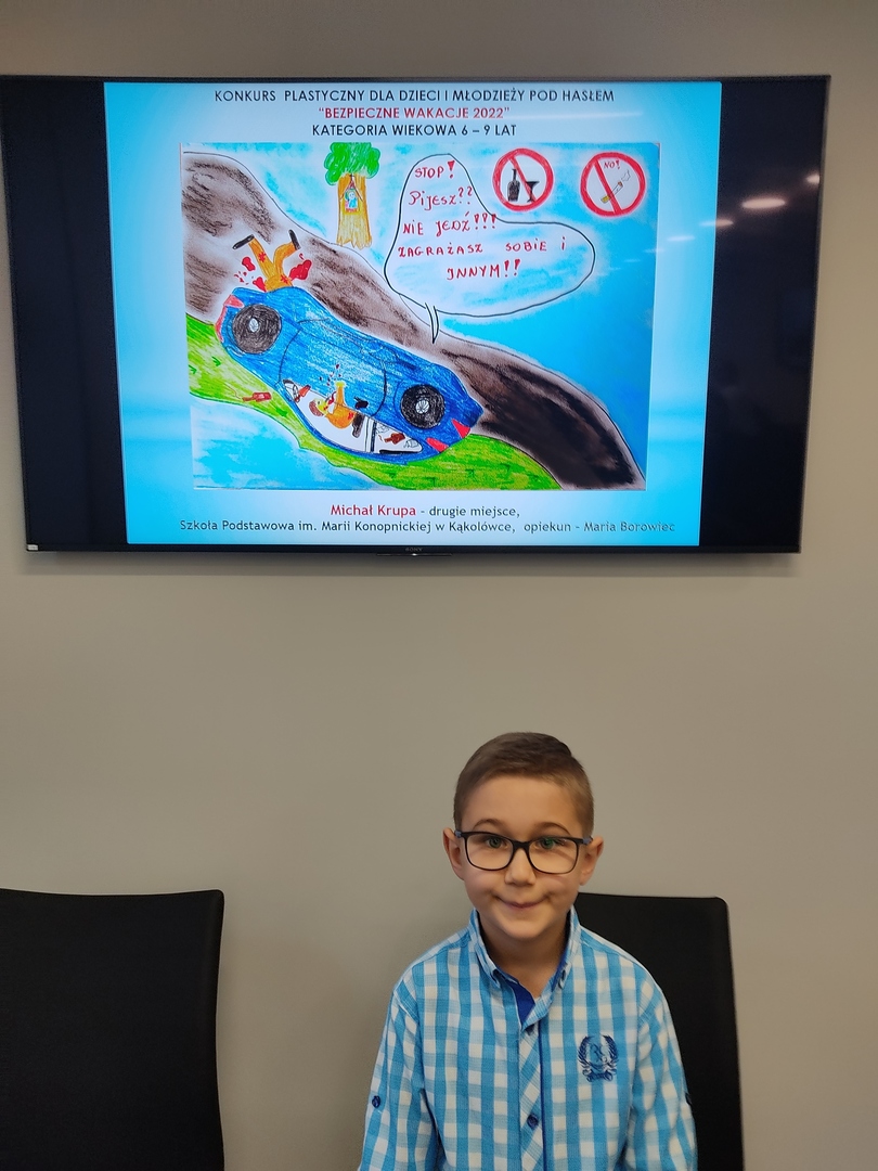 Znaczący sukces w tym konkursie osiągnął uczeń naszej szkoły Michał Krupa z klasy II, który zdobył drugą nagrodę za pracę ,,Pijesz, nie jedź".