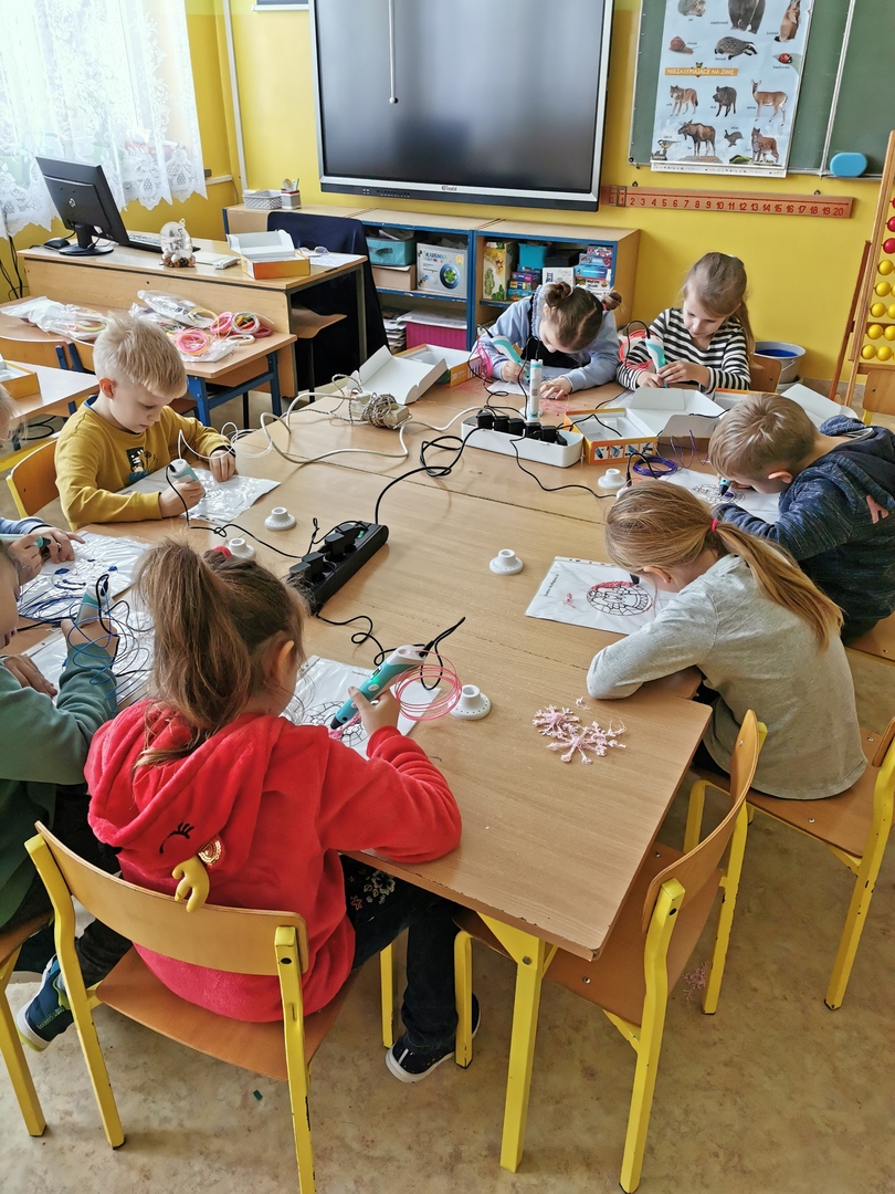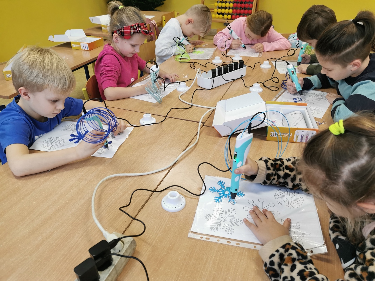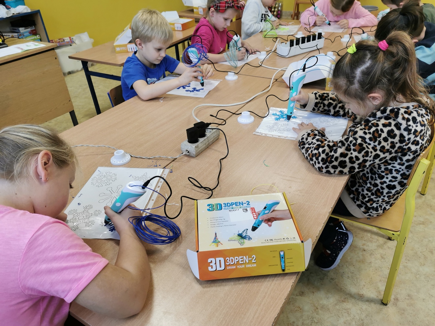 Uczniowie klasy pierwszej dołączyli do starszych kolegów i w ramach Laboratorium Przyszłości zapoznali się z działaniem długopisów 3D. 7 grudnia wykonali śniegowe gwiazdki, a dzisiaj (21 grudnia) ich celem było zrobienie świątecznych aniołków. Praca z długopisami okazała się niezwykłą przygodą i dostarczyła wszystkim wiele radości.