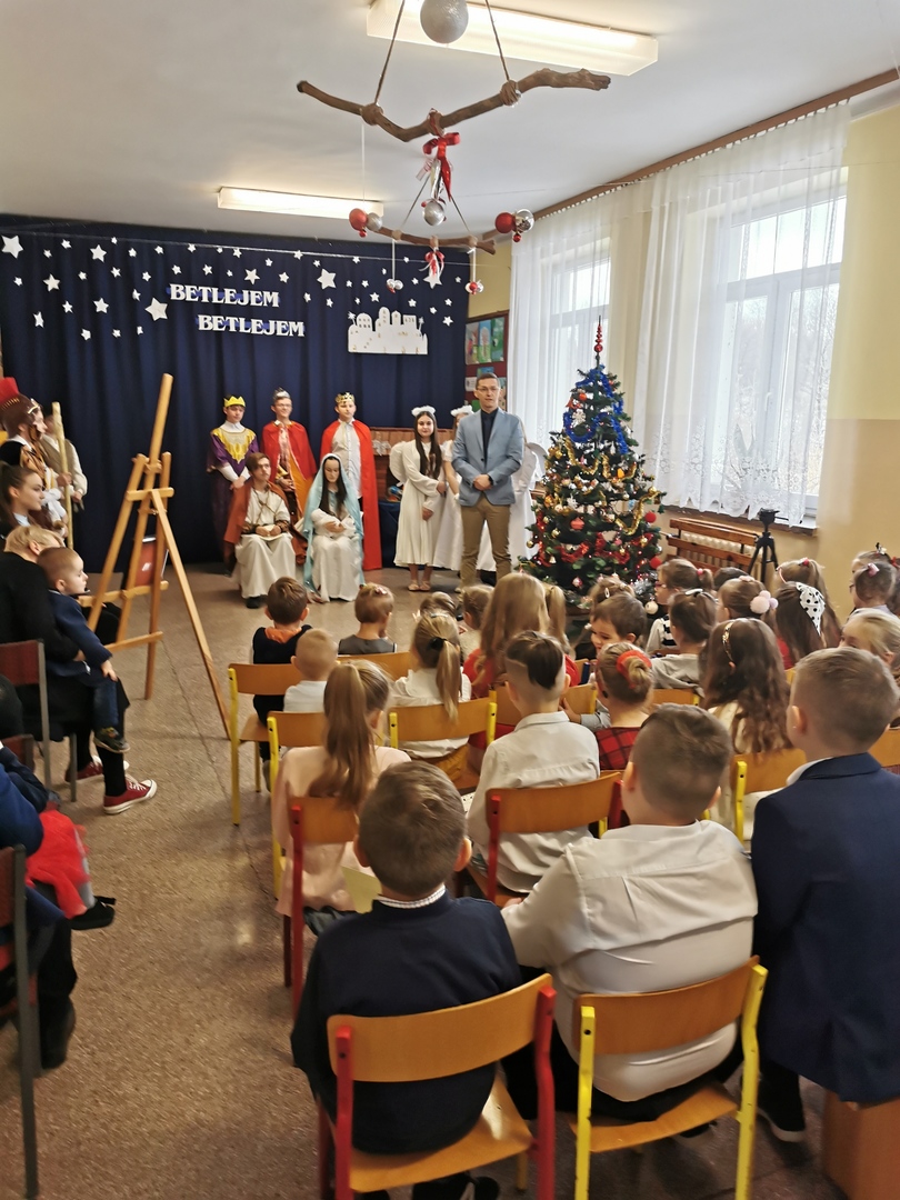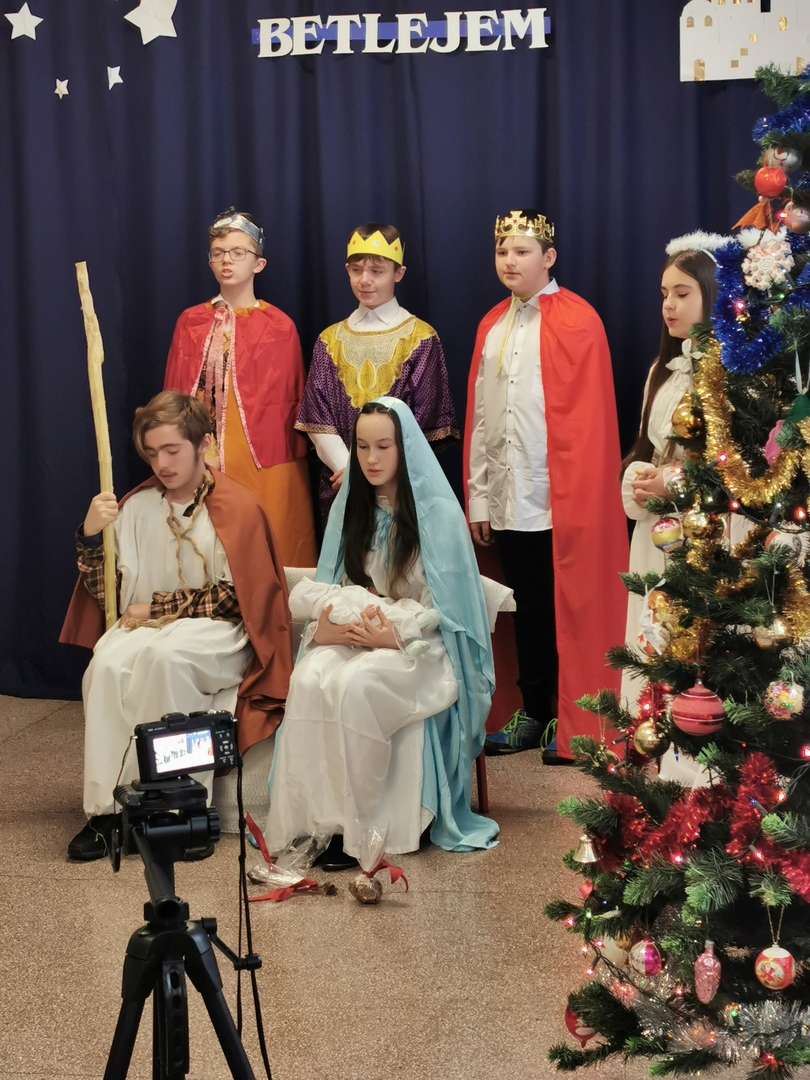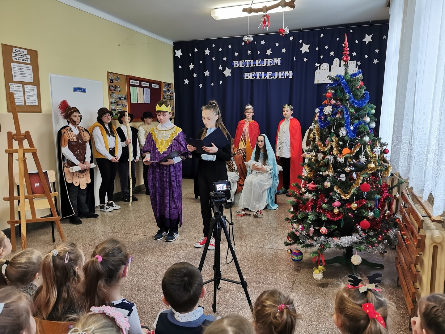 22 grudnia uczniowie klasy VIII przygotowali uroczysty apel z okazji Bożego Narodzenia. Piękna scenografia, kostiumy i oprawa muzyczna przedstawienia jasełkowego wprowadziły nas w świąteczny nastrój. Po życzeniach złożonych przez p. Dyrektora Rafała Flisaka udaliśmy się na wigilijny posiłek. A po nim wspólne śpiewanie kolęd. To były magiczne chwile!