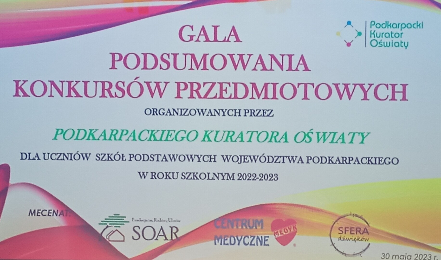 30 maja 2023 r. w G2A Arena Centrum Wystawienniczo - Kongresowym w Jasionce obyła się uroczysta gala podsumowania konkursów przedmiotowych organizowanych przez Podkarpackiego Kuratora Oświaty. Zaproszonie na uroczystość otrzymała oczywiście nasza uczennica Zuzanna Woźniak (kl.8), która w tym roku szkolnym uzyskała tytuł laureata w konkursie przedmiotowym z chemii. Dzięki temu Zuzia może skorzystać z przywilejów, które przysługują lauratom tzn. otrzymują z danych zajęć edukacyjnych najwyższą roczną ocenę klasyfikacyjną oraz przyjmowani w pierwszej kolejności do publicznej szkoły ponadpodstawowej.