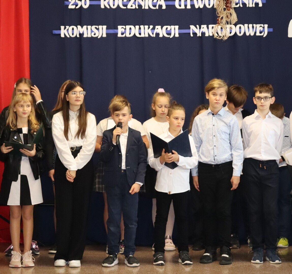 Dzień Edukacji Narodowej – polskie święto oświaty i szkolnictwa wyższego. W tym roku jest on szczególny, obchodzimy 250 rocznicę powstania Komisji Edukacji Narodowej, która została utworzona między innymi z inicjatywy króla Stanisława Augusta Poniatowskiego w dniu 14 października 1773 roku. Oczywiście również nasza szkoła włączyła się w upamiętnienie tego ważnego wydarzenia w historii Polski. Nasi uczniowie pod okiem pana Bogdana Kruczka, pani Joanny Jamróz i pana Wojciecha Kruczka przygotowali uroczystą akademię. W programie artystycznym przedstawiona został geneza obchodzonego święta. Uroczystość uświetniły piękne występy wokalne i instrumentalne. Przedstawiciele samorządu szkolnego w życzeniach skierowanych do nauczycieli i pracowników szkoły wyrazili wdzięczność za trud, wysiłek, oddanie, życzliwość i pomoc. Do życzeń przyłączył się także dyrektor szkoły, który podziękował nauczycielom za zaangażowanie, serce i cierpliwość. Zwrócił się również do całej społeczności szkolnej z życzeniami powodzenia i satysfakcji z podejmowanych działań w codziennej pracy.