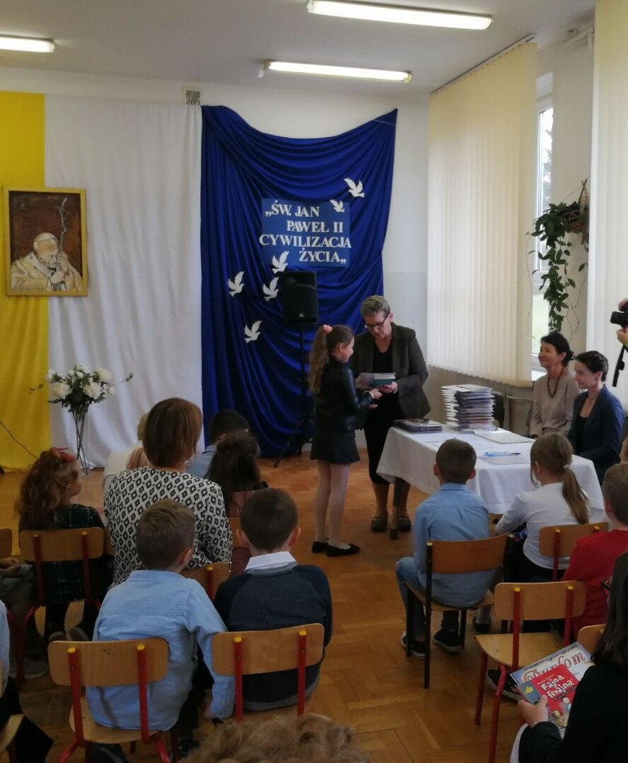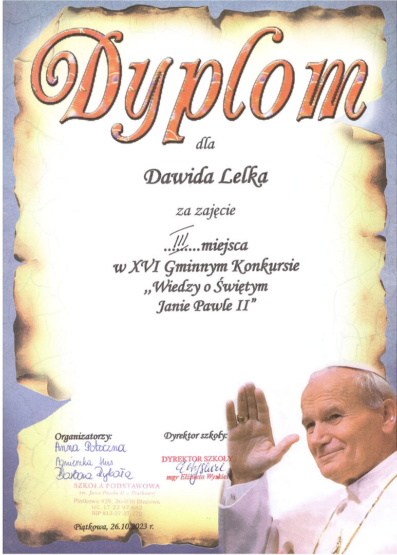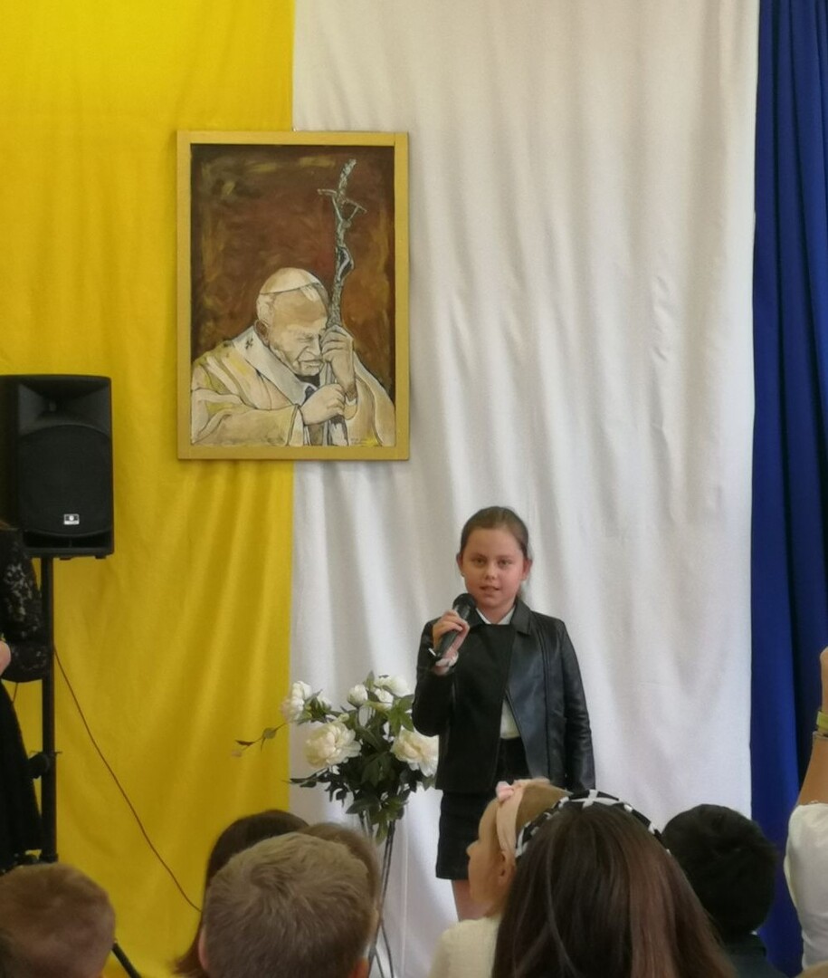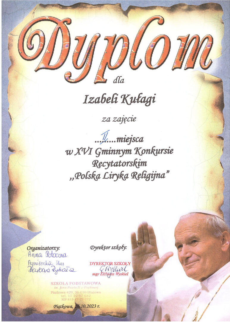 26.10.2023 r. z okazji dnia patrona w Szkole Podstawowej im. Jana Pawła II odbył się XVI Gminny Konkurs Recytatorski oraz Konkurs wiedzy o Janie Pawle II. Miło nam poniformować, że z bardzo dobrej strony zaprezentowali się nasi uczniowie. W konkursie recytatorskim "Polska Liryka Religijna" II miejsce zajęła uczennica klasy 3 - Izabela Kułaga. Natomiast w konkursie wiedzy nasza drużyna w składzie Dawid Lelek (kl.7) i Mateusz Bober (kl.7) wywalczyła III miejsce.