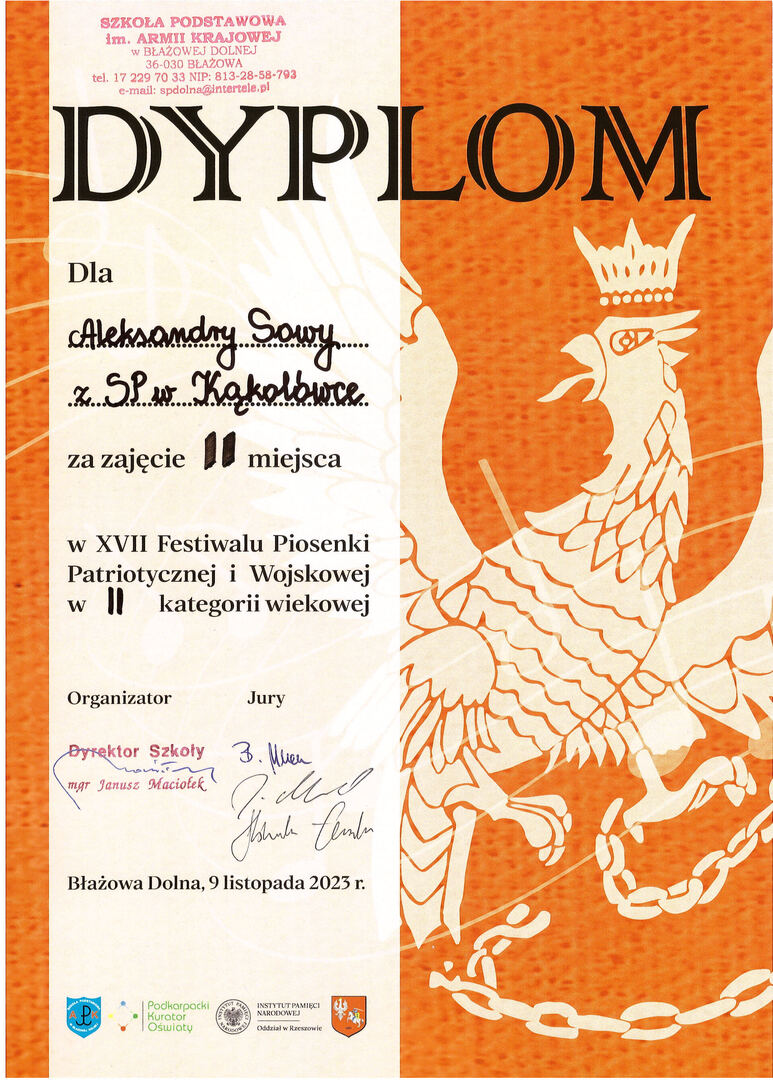 W czwartek, 9 listopada 2023 r. w Szkole Podstawowej w Błażowej Dolnej, odbył się XVII Festiwal Piosenki Patriotycznej i Wojskowej. Wzięli w nim udział nasi uczniowie. Miło nam poinformować, że uczennica z klasy VII – Aleksandra Sowa zajęła II miejsce w kategorii duety i soliści, natomiast zespół „Pierwszoklasistki” (klasa I), w składzie: Wiktoria Baran, Monika Borowiec, Wiktoria Cag, Julia Chochrek, Julia Gwizdała, Maria Jakubczyk, Lena Łuszcz, Weronika Paściak i Lena Ząbek, zajął III miejsce w kategorii zespoły. Wszystkim uczennicom gratulujemy!