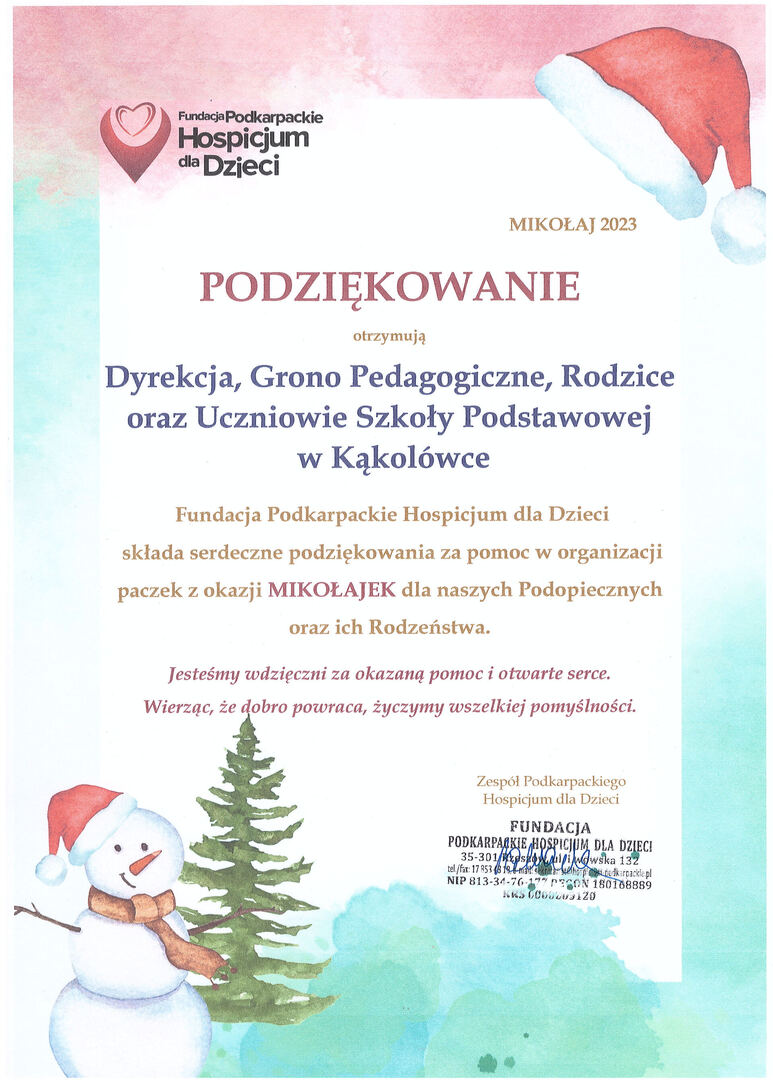W naszej szkole przeprowadziliśmy charytatywną akcję mikołajkową, która trwała w dniach 6 – 20 listopada. Przyniesione przez uczniów artykuły spożywcze, słodycze, zabawki, kosmetyki, środki czystości oraz pampersy już zostały przekazane Podopiecznym Fundacji Podkarpackiego Hospicjum dla Dzieci.