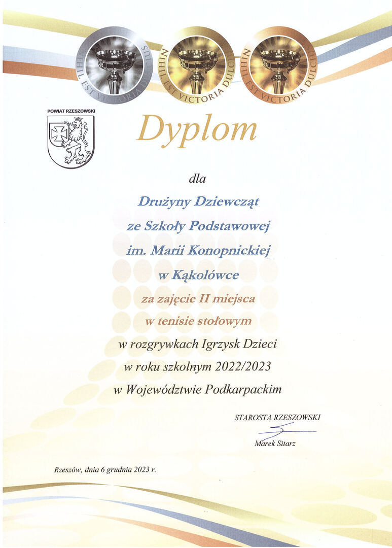 - II miejsce w kategorii dziewcząt ID (kl. 4-6) w drużynowym tenisie stołowym – Zuzanna Początek, Weronika Sapa i Julia Kozdraś.