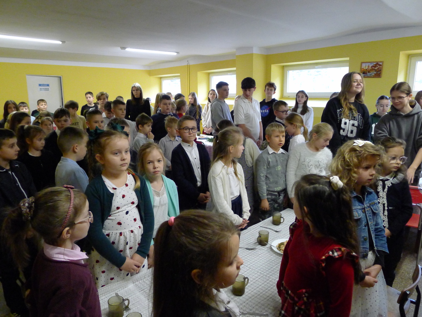 Szkoła to społeczność, którą tworzą mali i duzi ludzie. Bliskość Świąt Bożego Narodzenia przypomina nam o tym, że w szkole nie jesteśmy sami. Zebraliśmy się dzisiaj w szkolnej jadalni i tam przy pięknie nakrytych i ozdobionych stołach zjedliśmy uroczysty i pyszny posiłek.