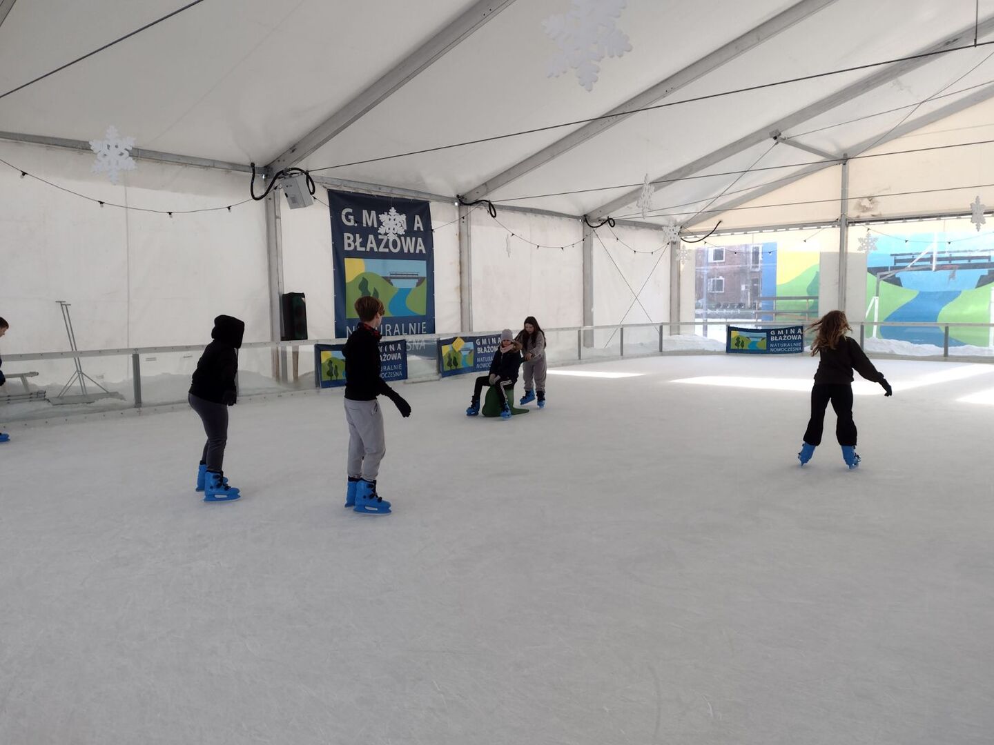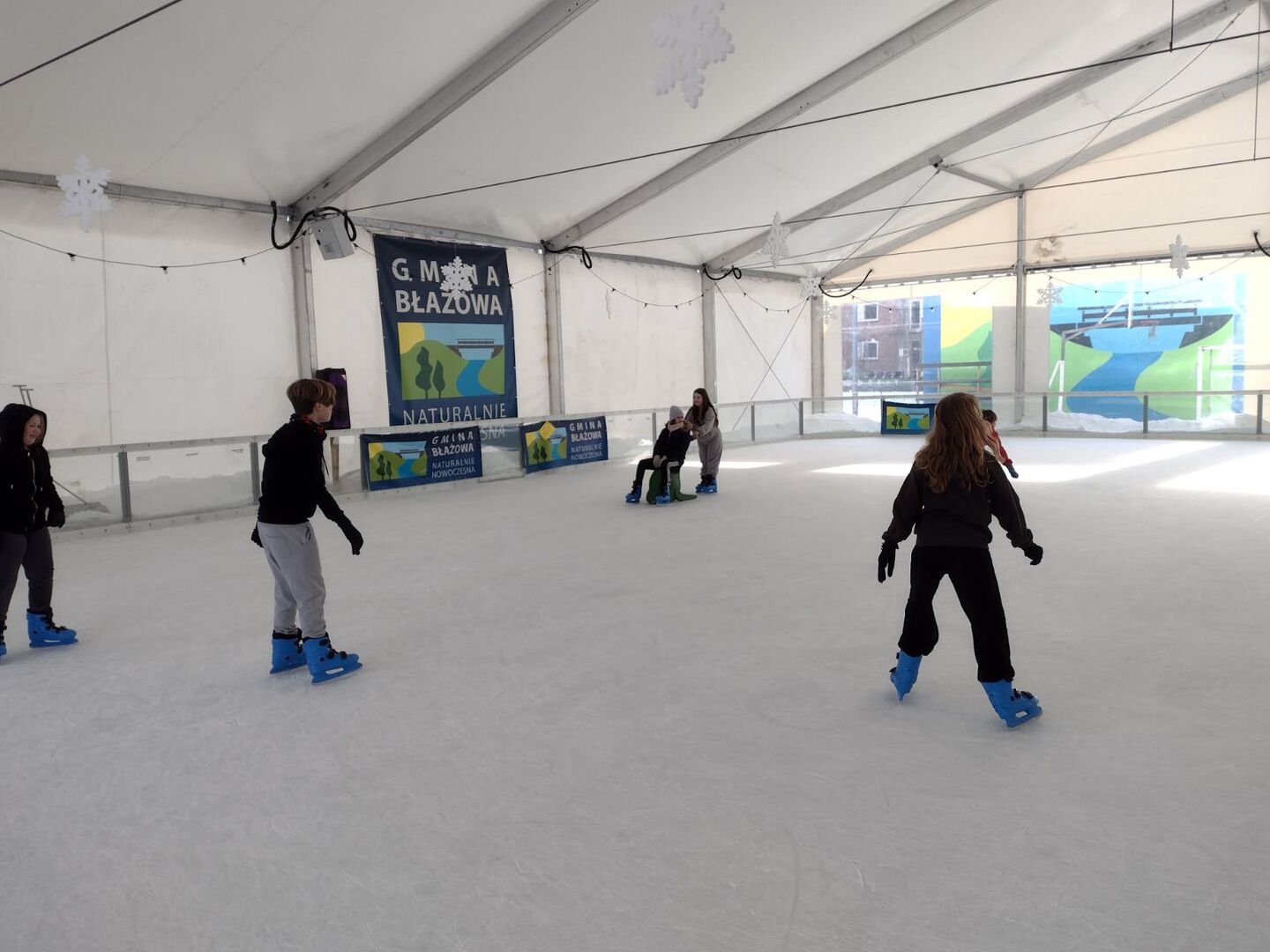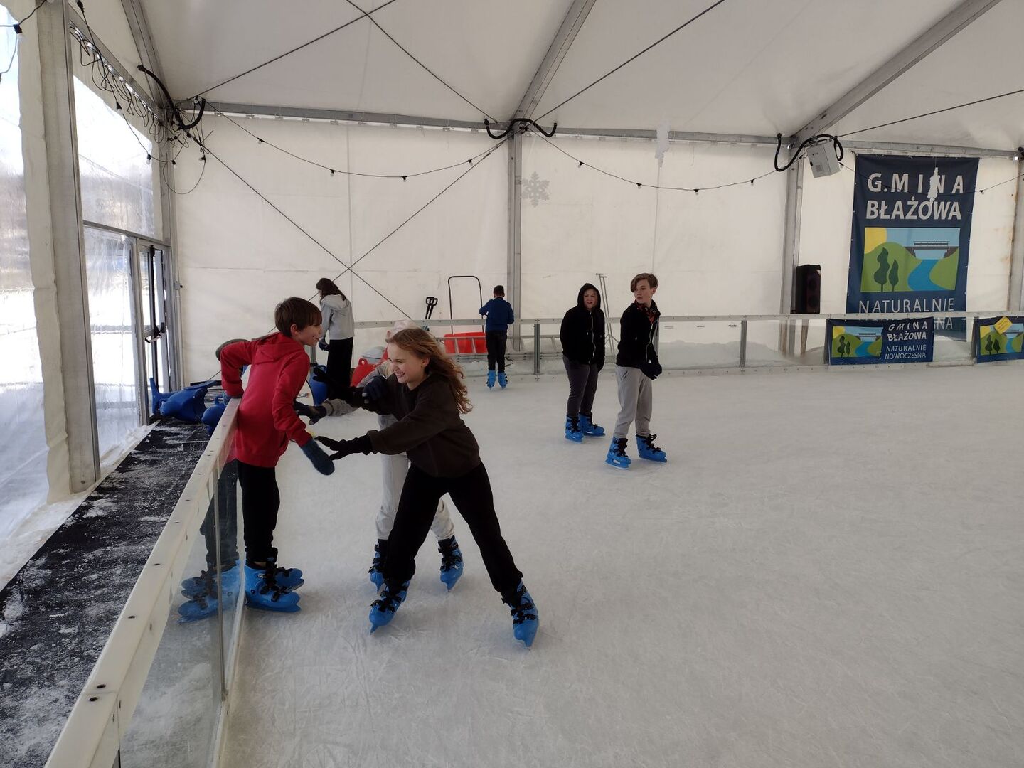 W poniedziałek, 22 stycznia wybraliśmy się z naszym wychowawcą na kryte lodowisko do Błażowej. Już od rana ogarnęły nas wielkie emocje i z niecierpliwością czekaliśmy na wyjazd. Na miejscu okazało się, że towarzyszami naszej dzisiejszej "lodowej przygody" będą uczniowie klasy IV i V ze Szkoły Podstawowej w Lecce. Zabawa zapowiadała się więc przednio i jak się wkrótce okazało zupełnie słusznie, a nasze łyżwiarskie umiejętności dzielnie fotografował nasz wychowawca, mocno trzymając się lodowego pingwinka.