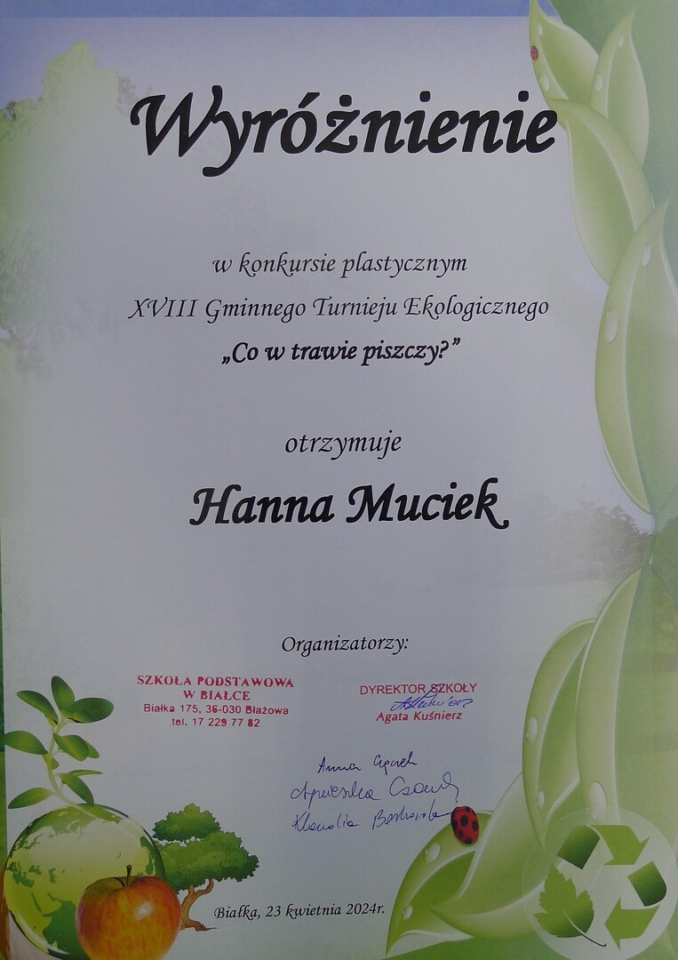W dniu 23.04.2024r. w Szkole Podstawowej w Białce odbył się Gminny Turniej Ekologiczny "Jesteśmy przyjaciółmi przyrody". Tegoroczna XVIII edycja odbyła się pod hasłem "Co w trawie piszczy?", a uczestnicy w ramach zadań konkursowych wykonali prace plastyczne pt. "Runo leśne" oraz prace techniczne pt. "Makieta Runa leśnego". Podczas rozstrzygnięcia konkursu uczniowie uczestniczyli w bardzo ciekawej prelekcji pracownika Nadleśnictwa Strzyżów oraz wzięli udział w warsztatach rękodzielniczych. Na koniec spotkania wspólnie zasadzili pamiątkowe drzewo. Nagrodę otrzymał Nikodem Sowa z klasy III, natomiast wyróżnienie otrzymała Hanna Muciek z klasy II.