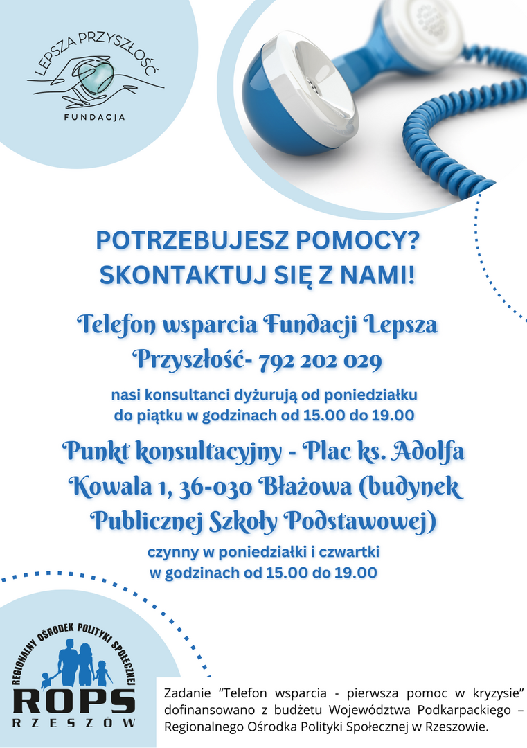 Fundacja Lepsza Przyszłość z siedzibą w Rzeszowie informuje, iż rozpoczęła realizację zadania publicznego pod tytułem „Telefon wsparcia – pierwsza pomoc w kryzysie”.