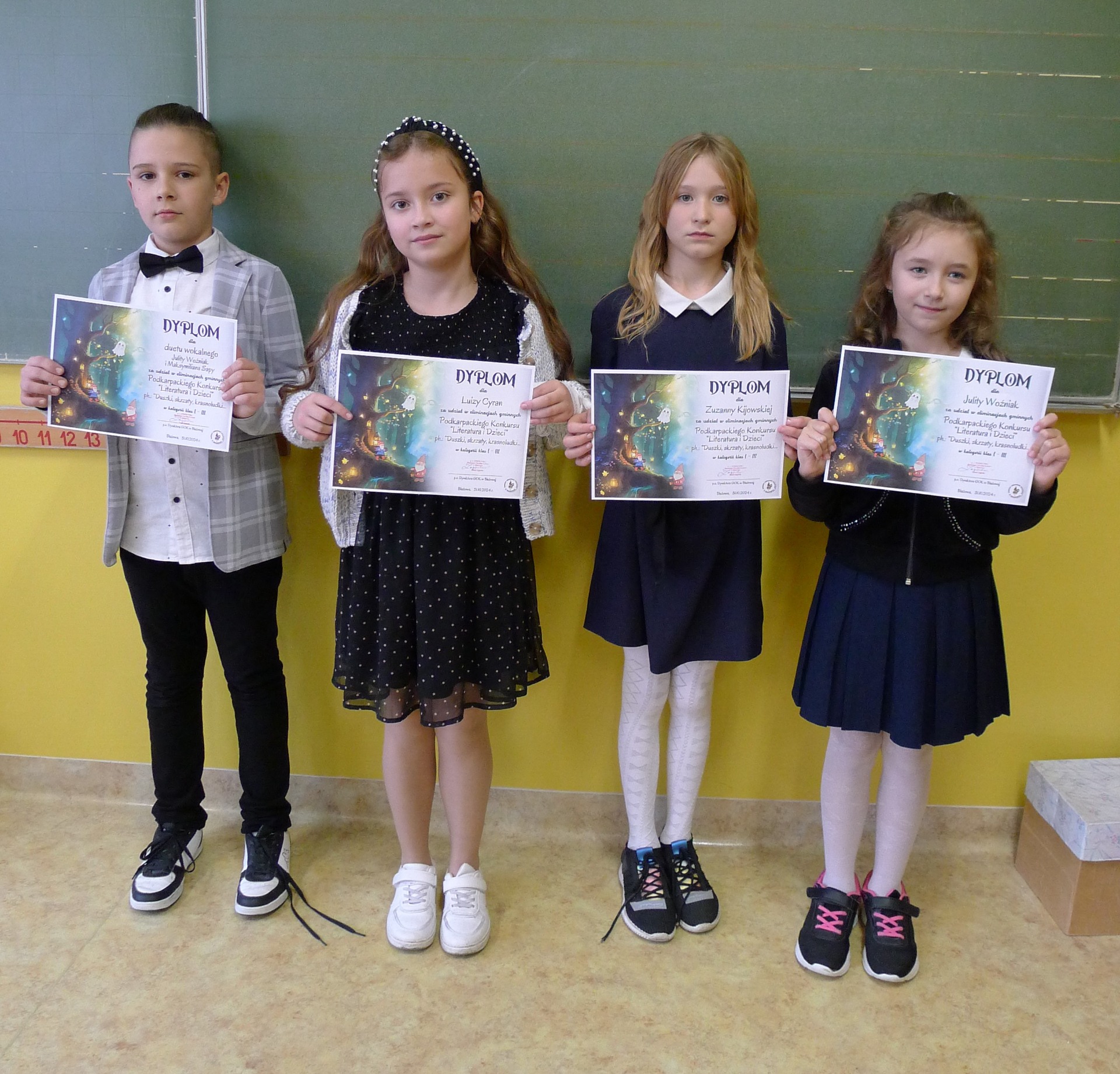 W Gminnym Ośrodku Kultury w Błażowej odbyły się dzisiaj eliminacje do Podkarpackiego Konkursu "Literatura i Dzieci" pt. "Duszki, skrzaty, krasnoludki...". Konkurs organizuje Wojewódzki Dom Kultury w Rzeszowie. Naszą szkołę reprezentowało czworo uczniów z klasy III. Byli to: Luiza Cyran, Zuzanna Kijowska, Julita Woźniak i Maksymilian Sapa.