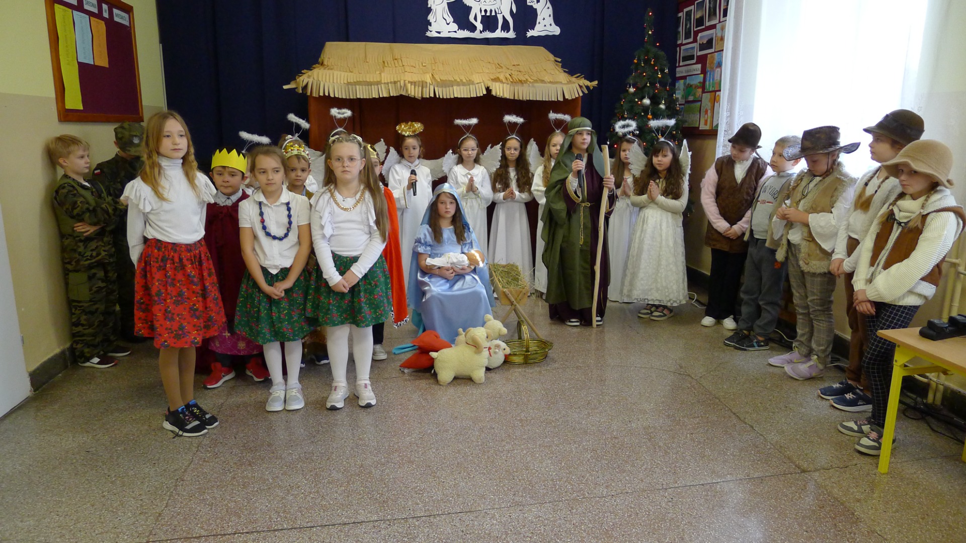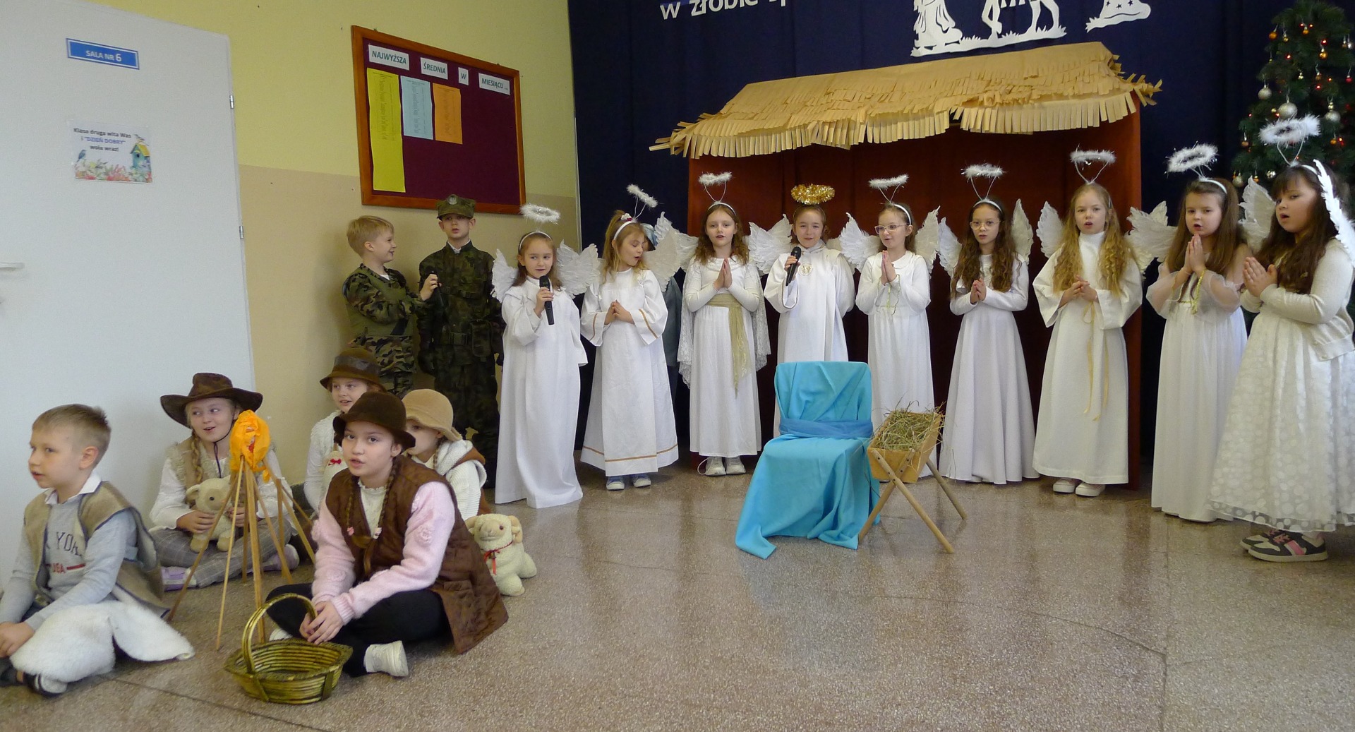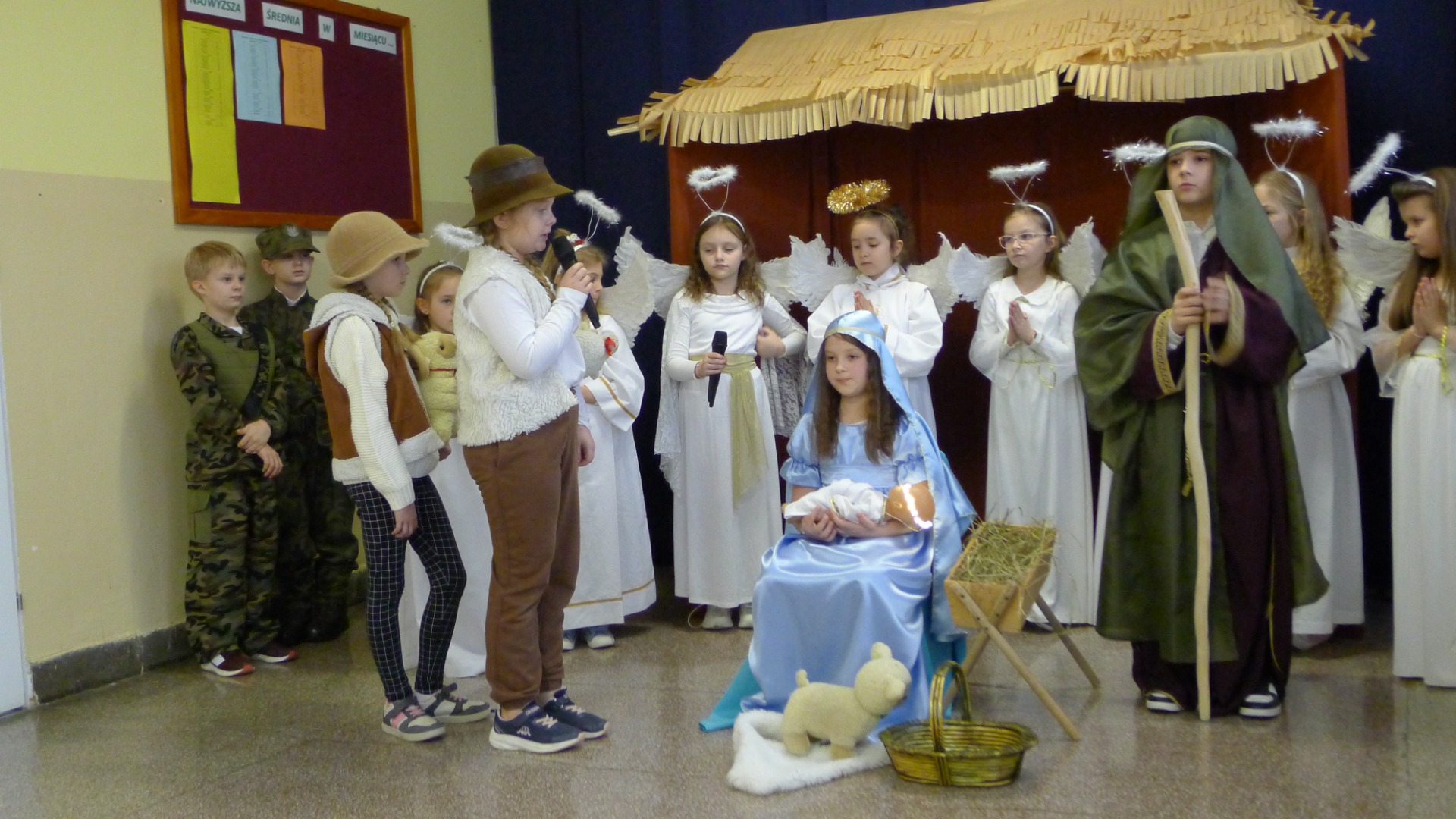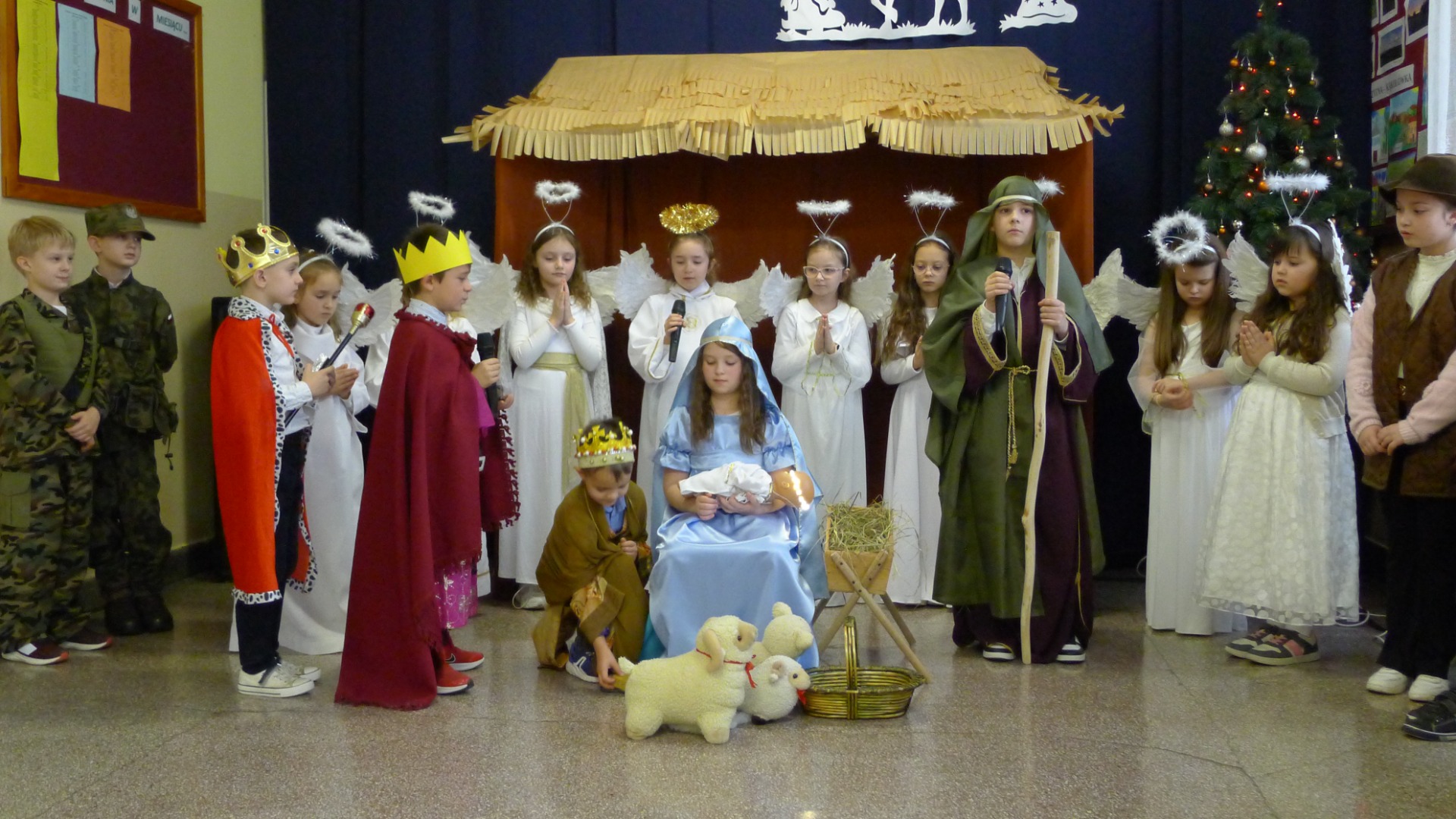 Dzisiejszego dnia przeżywaliśmy ponownie radość narodzin Bożego Syna. Stało się to za przyczyną uczniów z klasy I, II i III, którzy wcielili się w postacie biblijne i wystawili Jasełka. Przedstawienie, które emanowało spokojem i magicznym nastrojem, wprowadzało nas w stan świątecznego oczekiwania. Ciepłe, prosto z serc płynące teksty składały hołd Małemu Jezusowi. Całości dopełniła piękna dekoracja i brawurowo wykonane przez uczniów kolędy i pastorałki. Szkolni aktorzy zaprezentowali tradycyjną historię narodzin Jezusa Chrystusa. Stroje, muzyka, a przede wszystkim gra aktorska sprawiły, że wszystkie serca wypełniła radość i wprowadziła nas w świąteczny, radosny klimat.