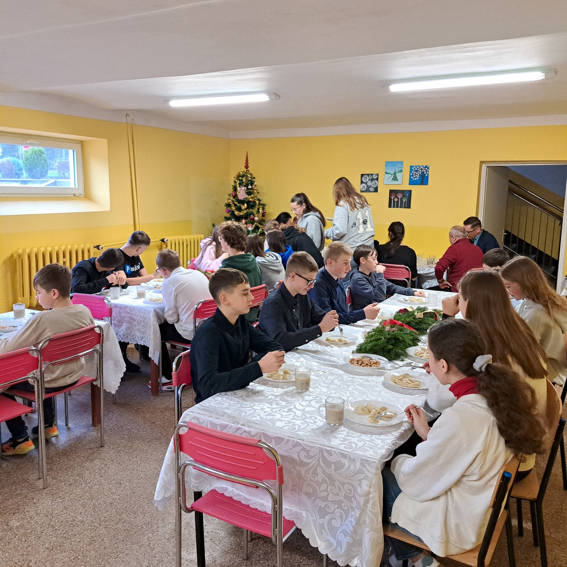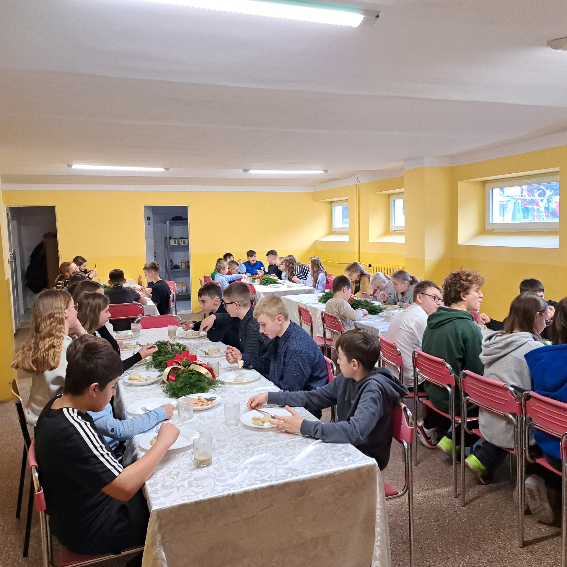 W piątkowe przedpołudnie nasi uczniowie zebrali się na korytarzu szkolnym, gdzie klasy I - III wystąpiły z przedstawieniem jasełkowym. Po występie był czas na podzielenie się opłatkiem i złożenie świąteczno-noworocznych życzeń. Klasy starsze udały się do jadalni szkolnej, a klasy młodsze do sali nr 7. Uczniowie zasiedli przy pięknie udekorowanych stołach i mogli delektować się pysznym posiłkiem. Zadbały o niego panie pracujące w szkolnej stołówce. Składał się on z białego barszczu, pierogów i gotowanej fasoli. Po posiłku uczniowie śpiewali kolędy i pastorałki. Wigilijny nastrój udzielił się każdemu z obecnych. Przeniesiemy go do swoich domów, by wkrótce świętować w rodzinnym gronie.