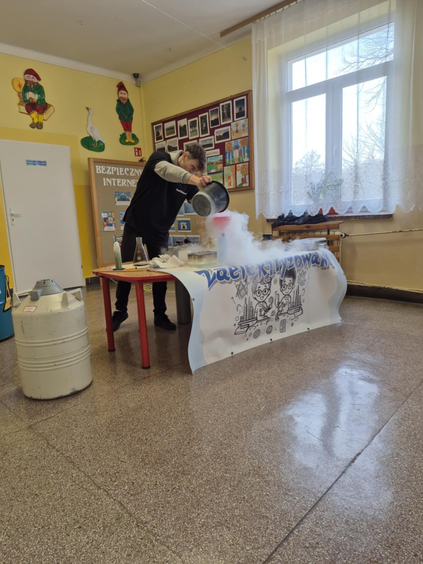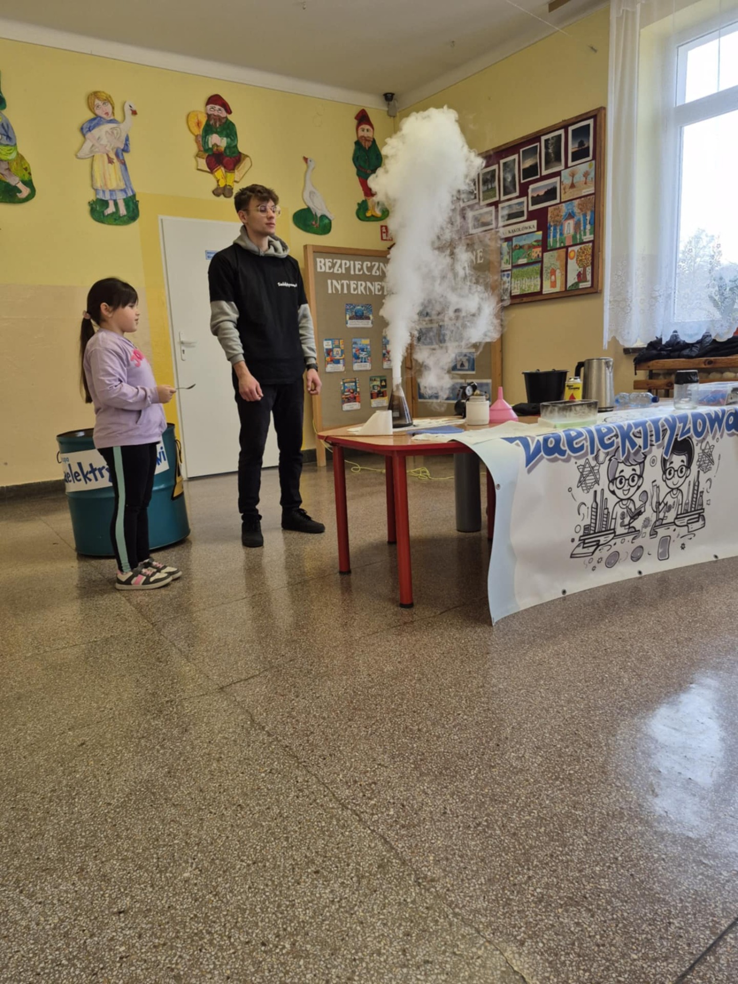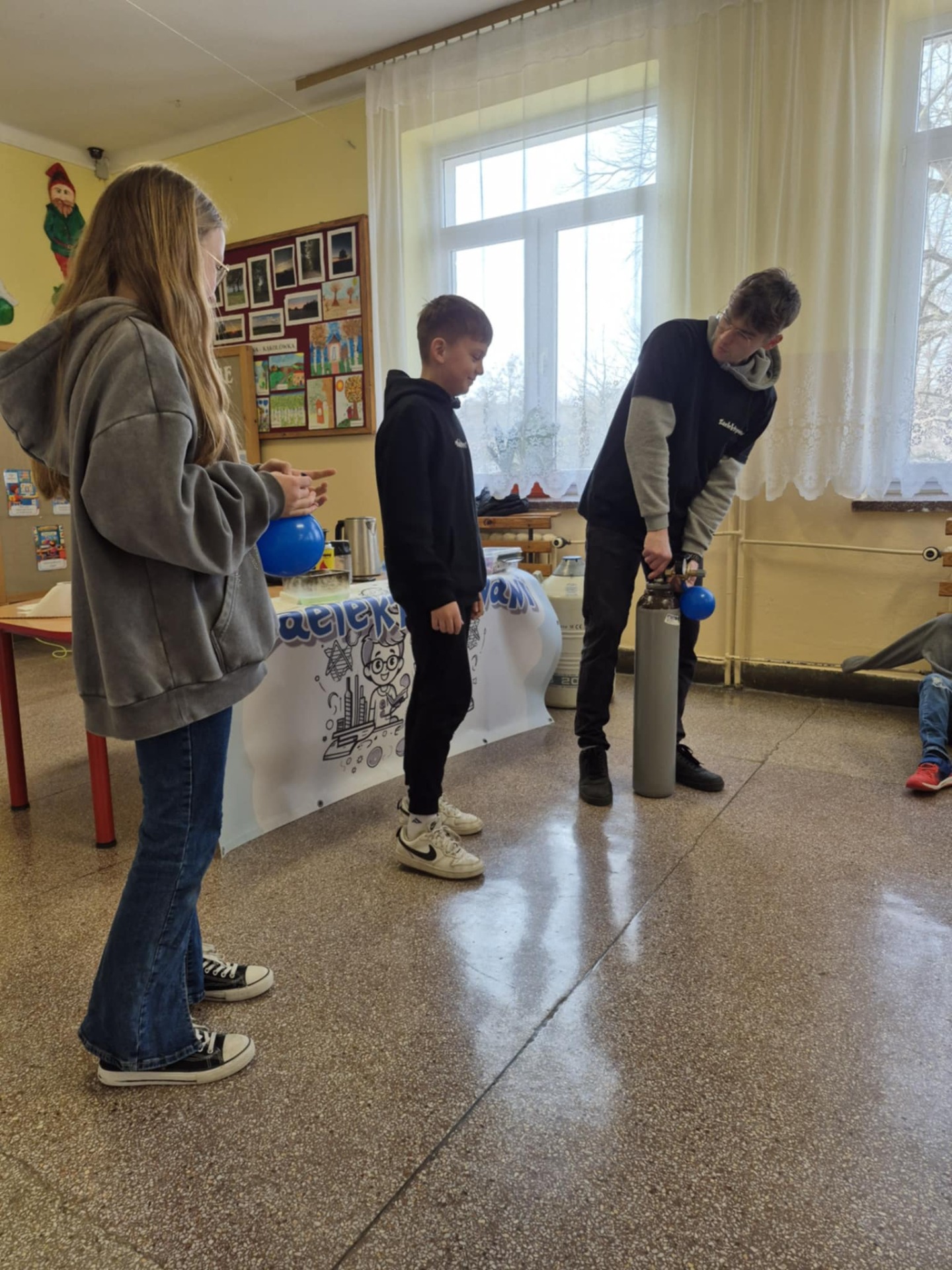 7 lutego w naszej szkole zawitała grupa „Zaelektryzowani”, która w prosty i atrakcyjny sposób zaprezentowała eksperymenty z dziedziny fizyki i chemii. Tematem zajęć były właściwości fizyczno-chemiczne wybranych gazów. Mogliśmy zobaczyć m.in. powstanie pary wodnej z użyciem wody utlenionej i nadmanganianu potasu, doświadczenia z użyciem helu, mieszanki propan-butan, czy ciekłego azotu. Organizatorzy zwrócili uwagę na kwestię bezpieczeństwa, uświadamiając uczniom, aby nie wykonywały doświadczeń samodzielnie i bez nadzoru osoby dorosłej. Uczniowie mieli też możliwość udziału w pokazie, co wywołało wiele radości i uśmiechu. Miło i pożytecznie spędzając czas poszerzyli swoją wiedzę z zakresu chemii i fizyki.