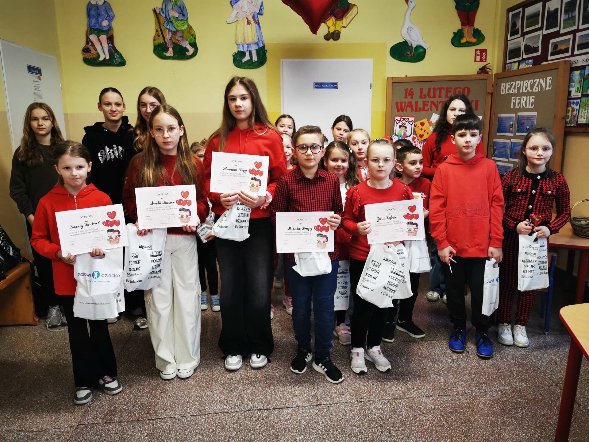 W tym roku samorząd uczniowski zorganizował również szkolny konkurs na najładniejszą kartkę walentynkową. Uczniowie przygotowali wiele wspaniałych prac, a jury miało wielki dylemat z wyborem tych najpiękniejszych. Ostatecznie jednak równorzędne nagrody otrzymali: Julia Ząbek, Zuzanna Kozdraś, Michał Krupa, Amelia Muciek oraz Weronika Sapa. Pozostali uczestnicy zostali nagrodzenie walentynkowymi słodkościami. Wszystkim serdecznie gratulujemy!
