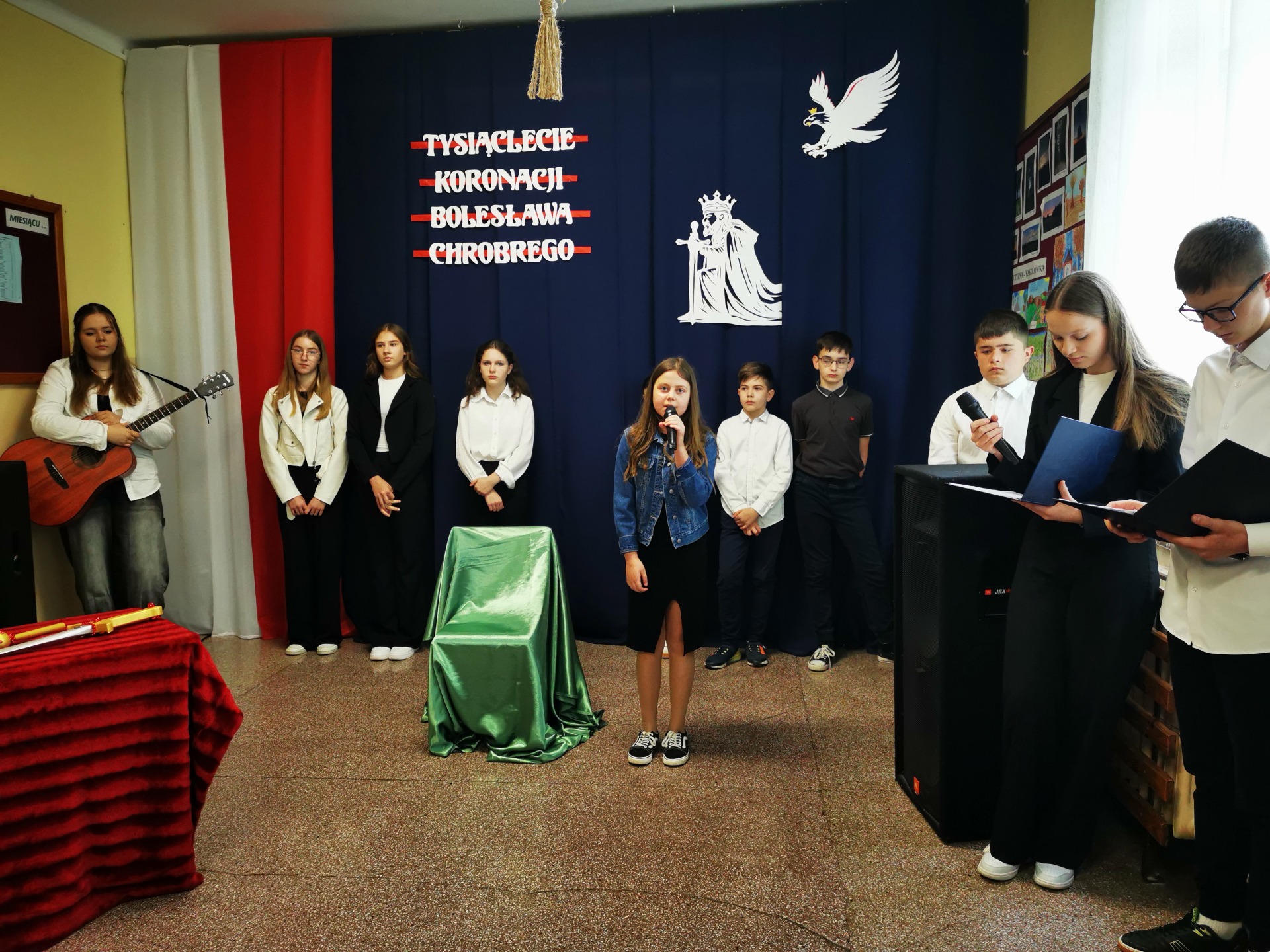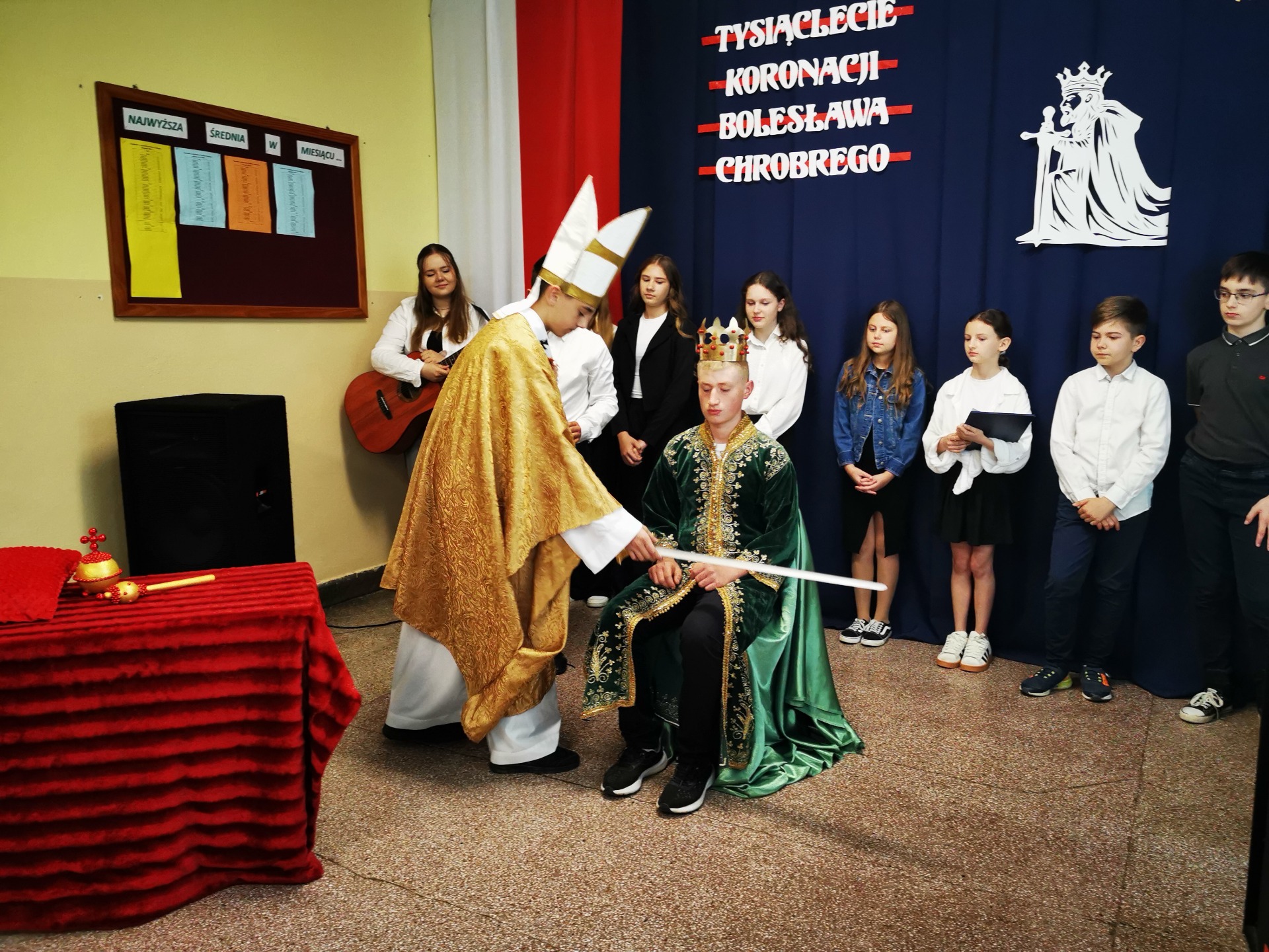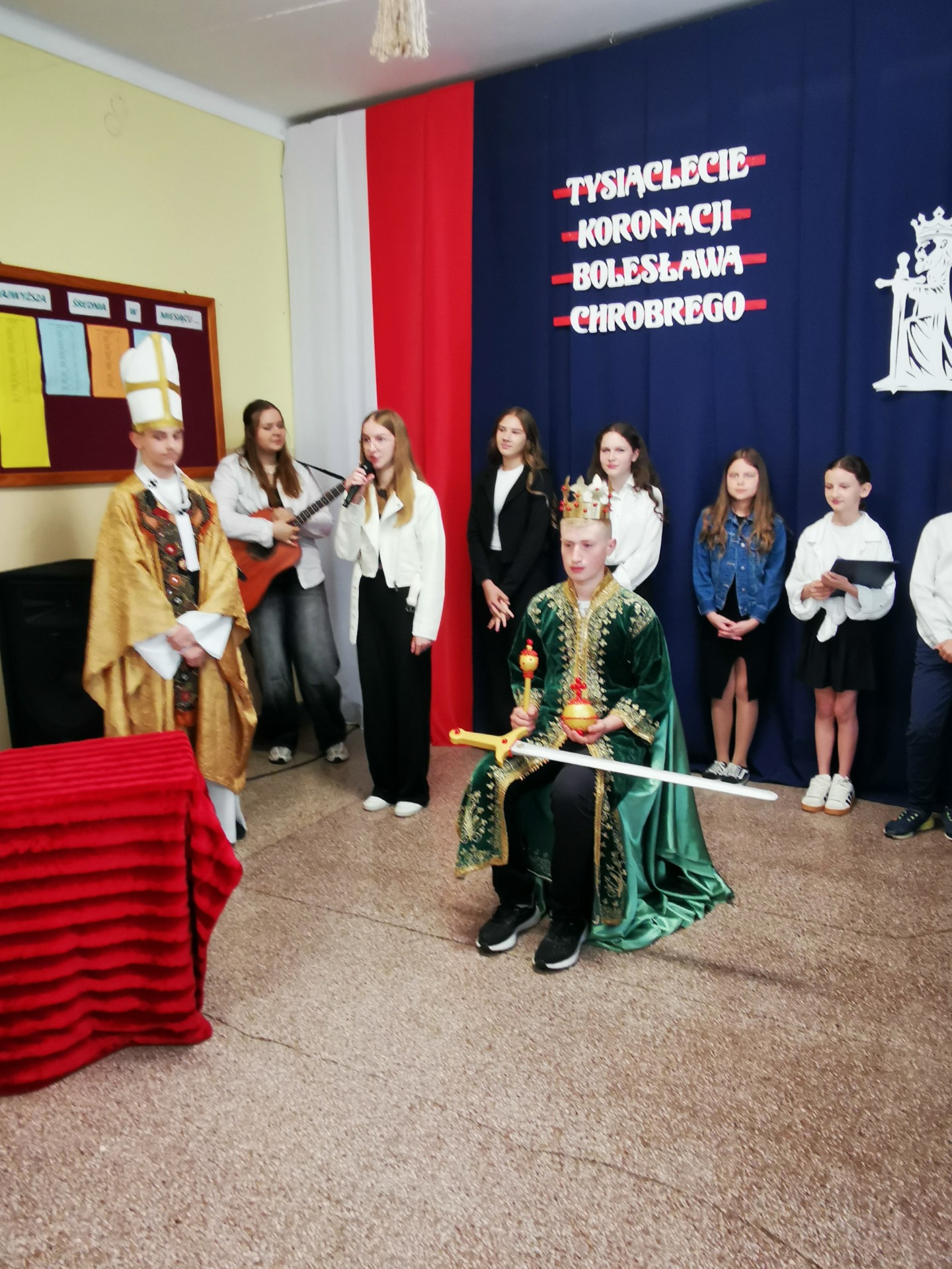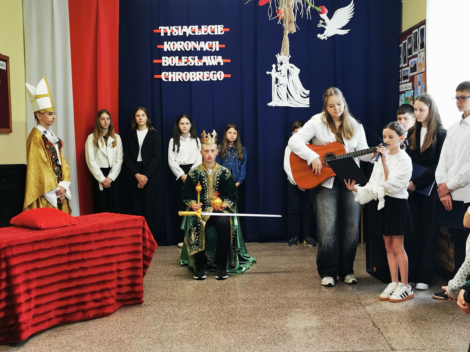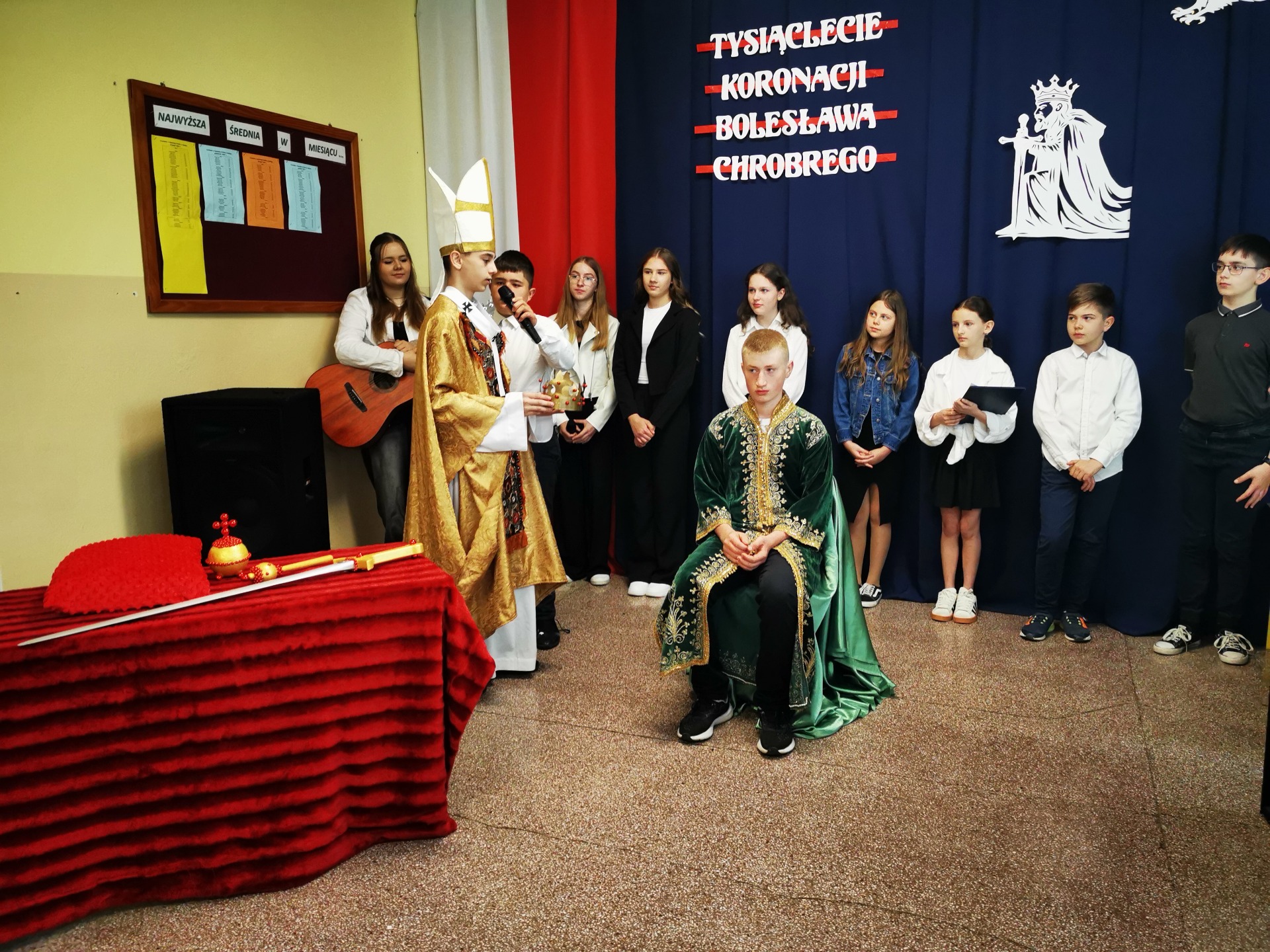 Z tej to właśnie okazji w piątek, 25 kwietnia w naszej szkole odbyła się uroczysta akademia, dzięki której wszyscy mogliśmy upamiętnić wydarzenia sprzed tysiąca lat. Uczniowie klasy VII, VI, V i IV przygotowali piękny program, w czasie którego mogliśmy zobaczyć uroczystą koronację Bolesława Chrobrego dokonaną przez arcybiskupa gnieźnieńskiego Hipolita. Na koniec, całość programu została upiększona wykonaniem piosenki pt. "Jak długo na Wawelu" przy akompaniamencie gitary przez Aleksandrę Sowę z kl. VIII oraz Milenę Dziepak z kl. VI.