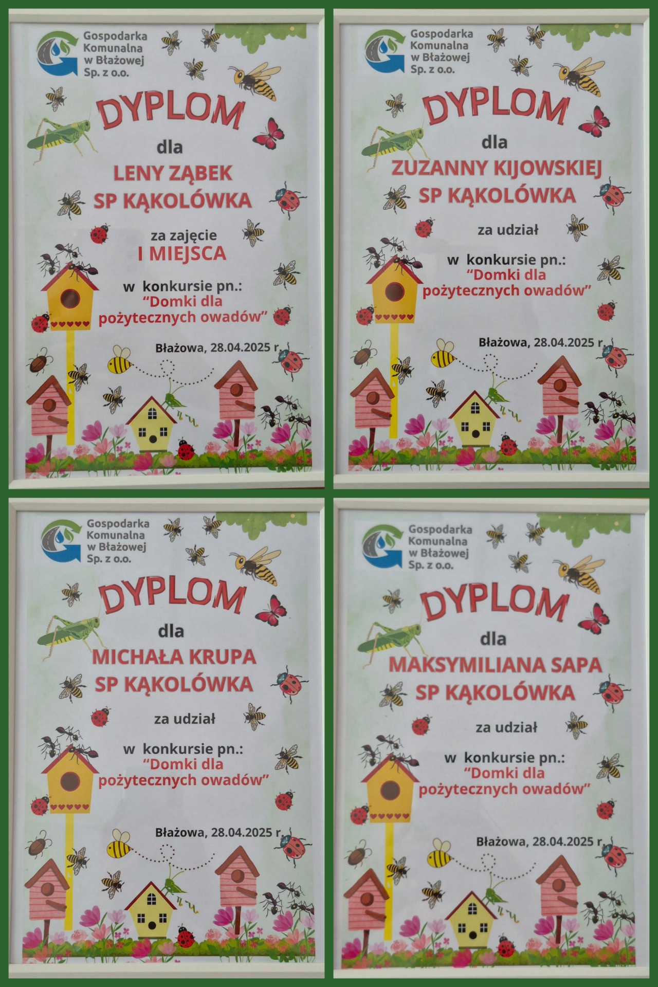Miło nam poinformować, że uczniowie naszej szkoły wzięli udział w konkursie „Domki dla pożytecznych owadów” zorganizowanym przez Gospodarkę Komunalną w Błażowej. Lena Ząbek z klasy II zdobyła I miejsce, natomiast Michał Krupa z klasy IV, Zuzanna Kijowska i Maksymilian Sapa z klasy III otrzymali wyróżnienia. Gratulujemy!!!