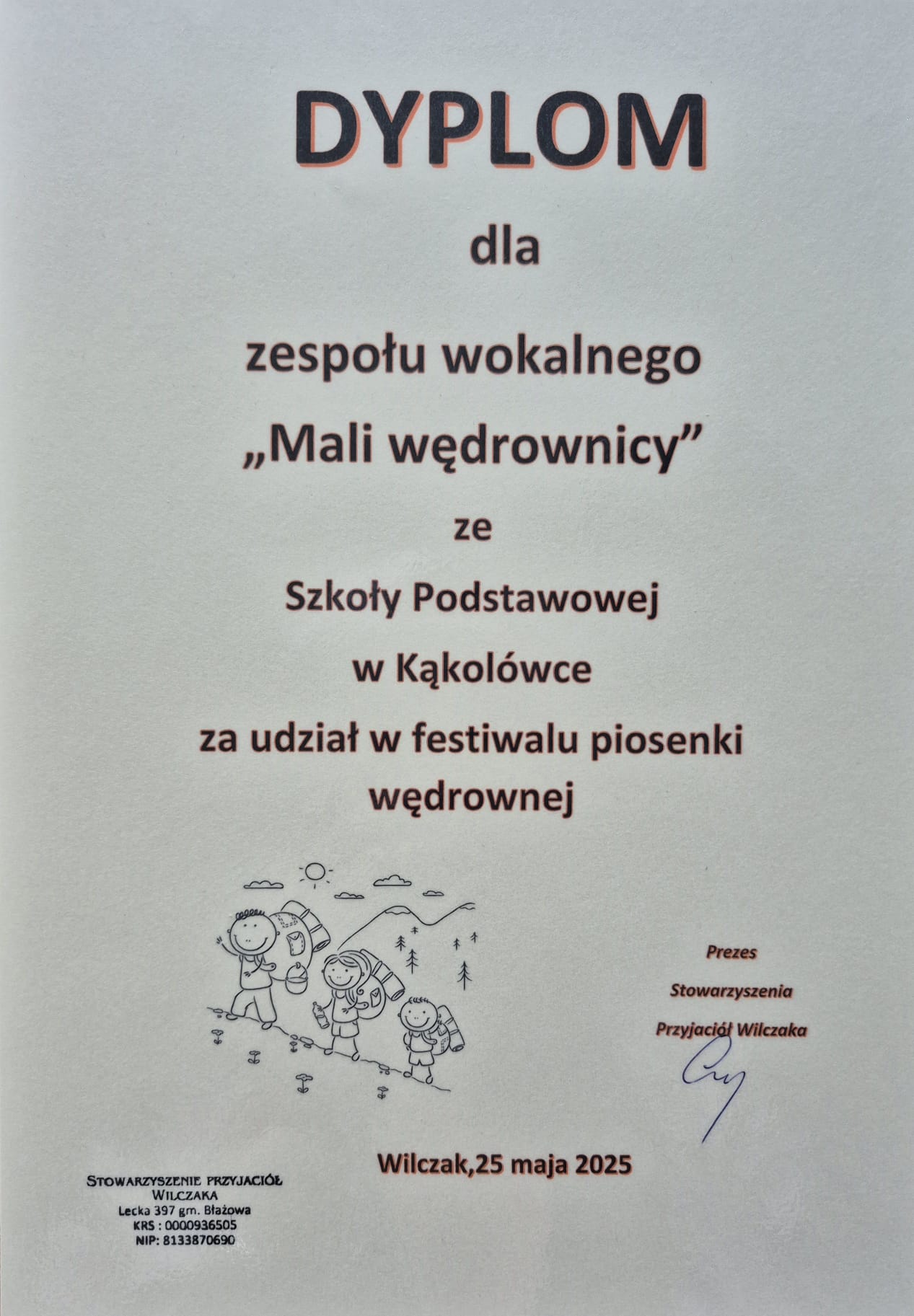 25 maja chętni uczniowie z klas I-III wystąpili podczas Festiwalu Piosenki Wędrownej na Wilczaku. Zaśpiewali piosenkę pt. "Na wędrówkę" i pięknie zaprezentowali swoje umiejętności wokalne. Dziękujemy uczniom, którzy godnie reprezentowali naszą szkołę na imprezie zorganizowanej przez Stowarzyszenie Przyjaciół Wilczaka.
