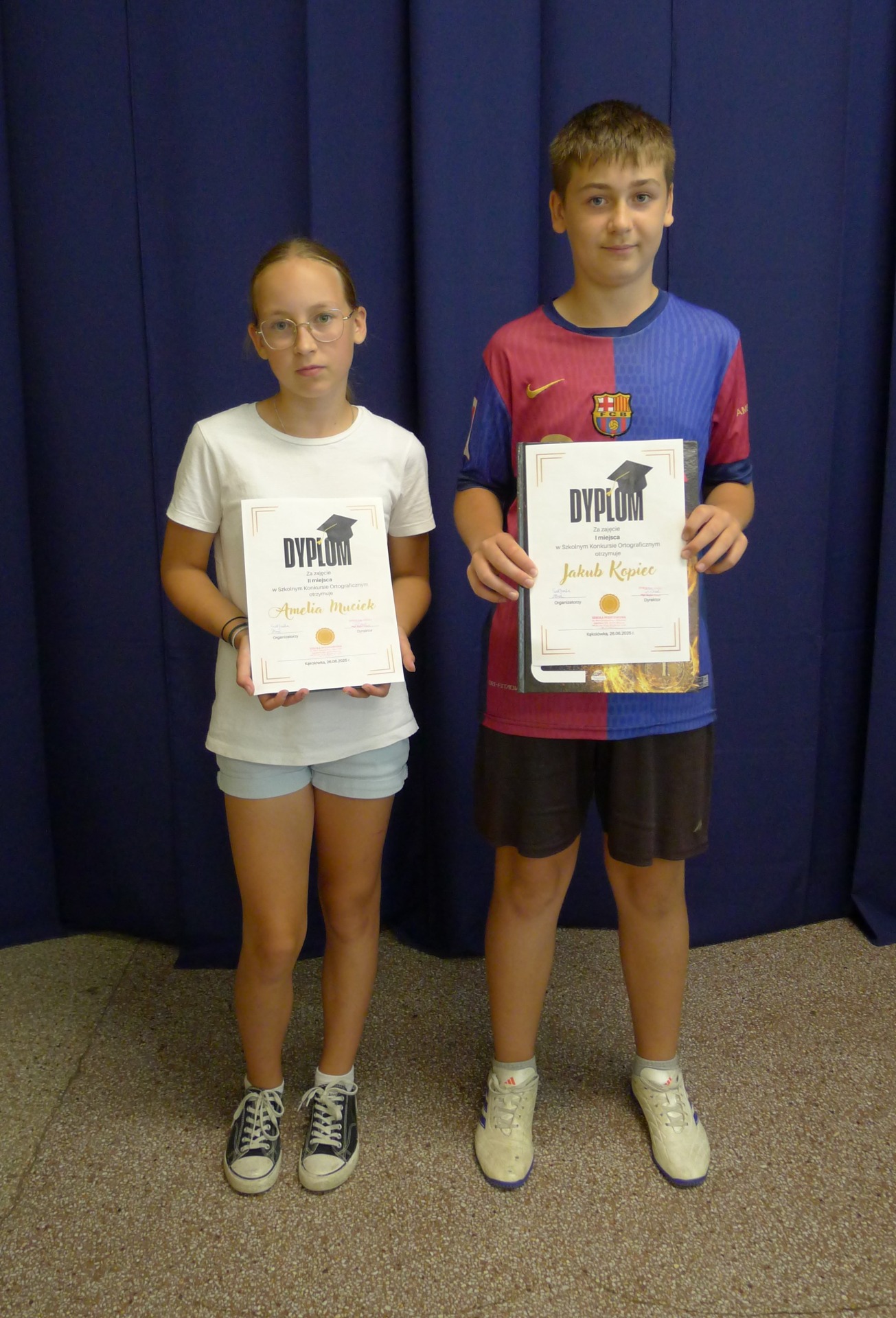 26 czerwca zostały rozdane dyplomy i nagrody książkowe w szkolnych konkursach ortograficznych. Tytuł "Mistrza Ortografii" w klasach młodszych zdobyły: Oliwia Woźniak z kl. I, Lena Ząbek z kl. II i Luiza Cyran z kl. III. W starszych klasach w Szkolnym Konkursie Ortograficznym I miejsce zajął Jakub Kopiec z kl. VI, II miejsce zdobyła Amelia Muciek z kl. VI, a III miejsce przypadło Weronice Dudek z kl. VIII. Gratulujemy!