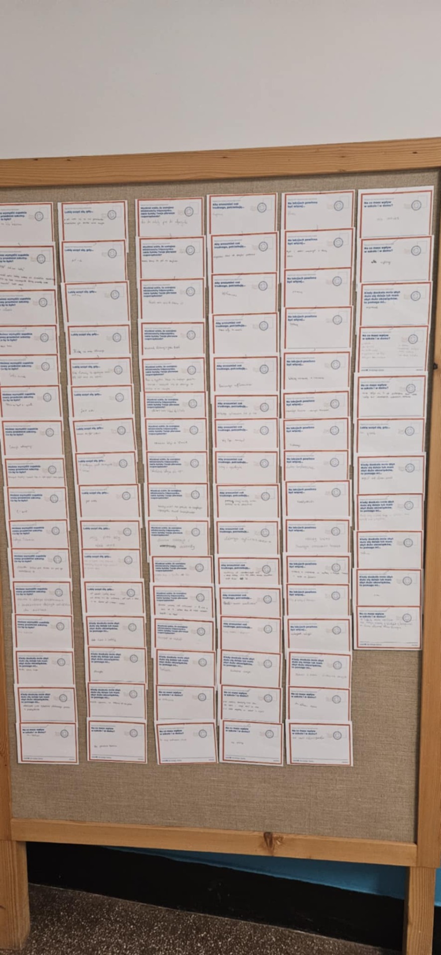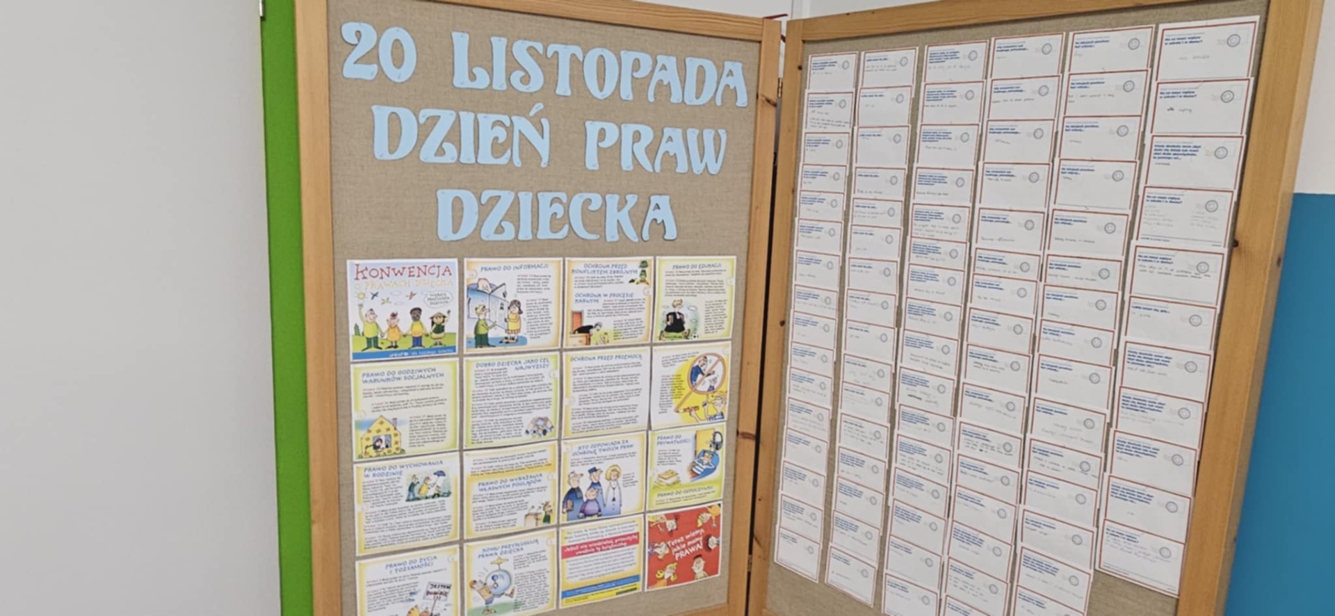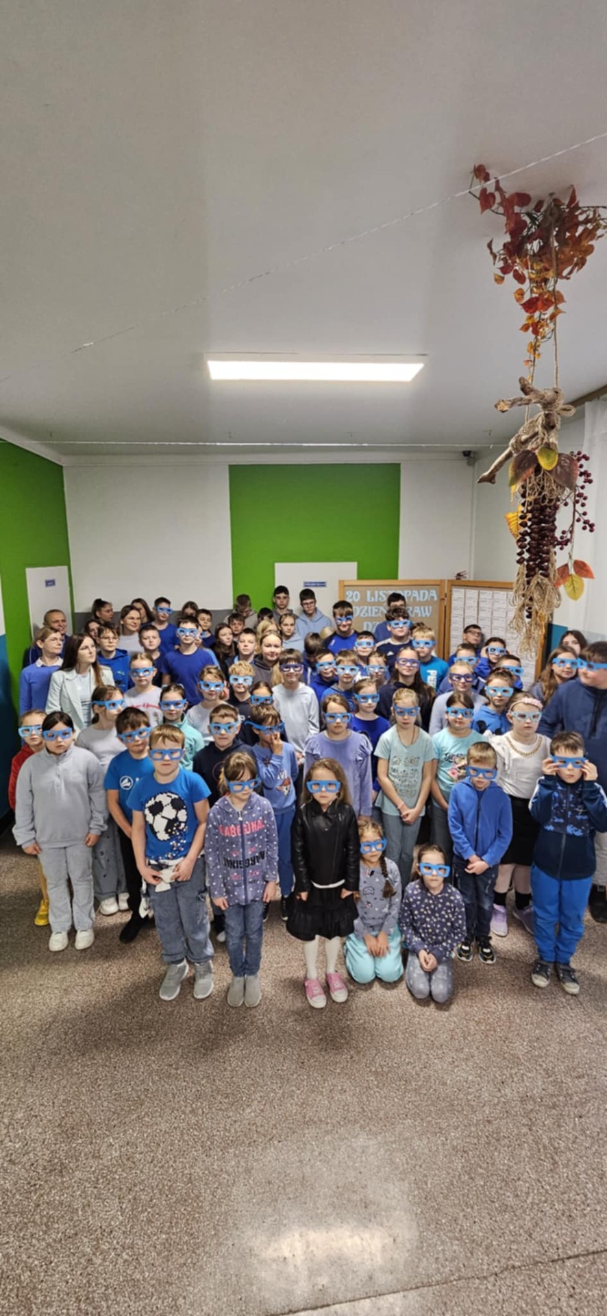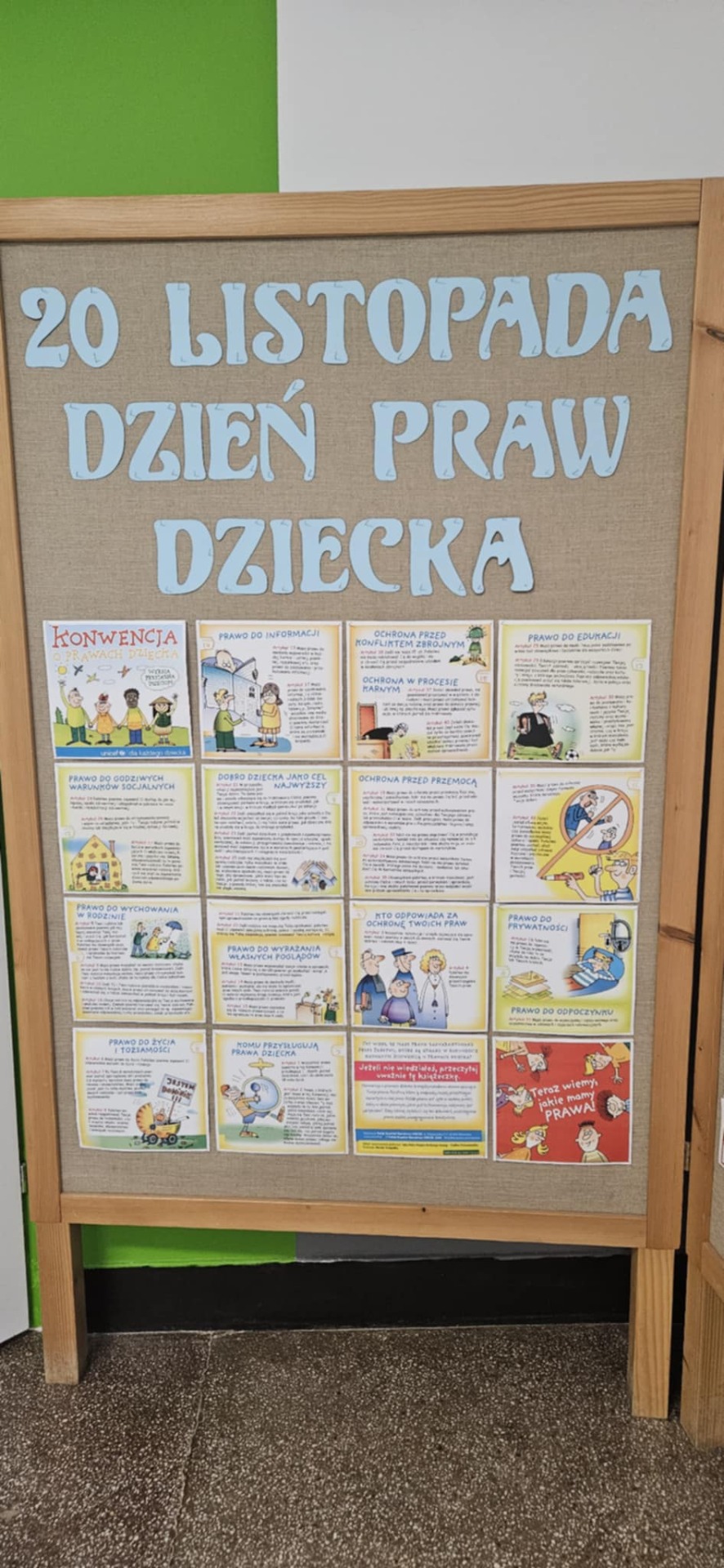 W naszej szkole obchodziliśmy Międzynarodowy Dzień Praw Dziecka. Z tej okazji uczniowie ubrali się na niebiesko, okazując solidarność z dziećmi na całym świecie. W klasach powstały także symboliczne niebieskie okulary, które uczniowie wykonali i założyli, aby „spojrzeć na świat oczami dziecka”. W ramach obchodów zachęciliśmy dzieci i młodzież do dzielenia się emocjami, przemyśleniami i pomysłami dotyczącymi tego, jak prawa dziecka przejawiają się w ich codziennym życiu. Na szkolnym korytarzu można było podziwiać gazetkę przedstawiającą prawa dziecka, a uczniowie klasy VII z dużym zaangażowaniem przygotowali okolicznościowe pocztówki. W swoich pracach wyrazili nie tylko wiedzę, lecz także emocje i refleksje związane z prawami dziecka. Wspólnie stworzyliśmy galerię pocztówek, która została zaprezentowana na szkolnej tablicy. Nasze obchody miały na celu szerzenie świadomości i wrażliwości na prawa każdego dziecka – wartości, które są fundamentem naszej szkolnej społeczności.