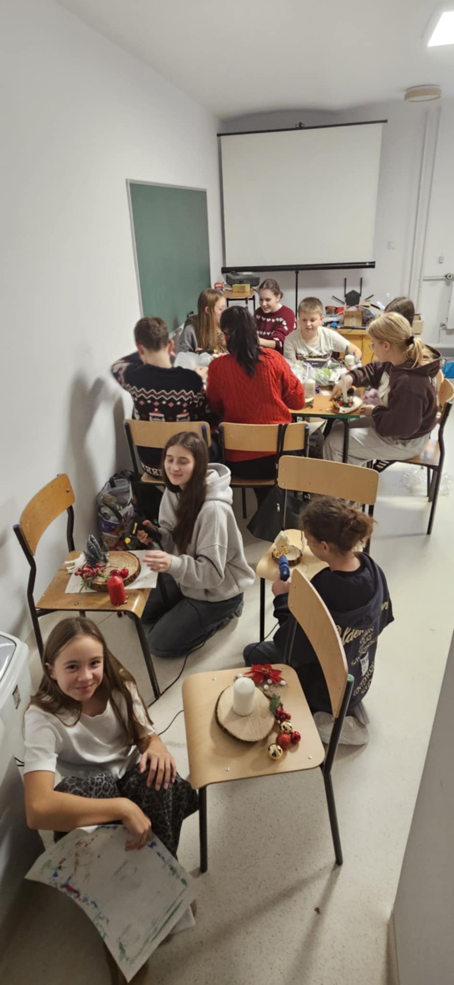 Po dzisiejszym mikołajkowym wyjeździe na kręgle, klasa 7 spotkała się w szkole, żeby wspólnie przygotować stroiki świąteczne na nasz szkolny kiermasz. Atmosfera była fantastyczna – pełna śmiechu, rozmów i zapachu świątecznych gałązek. W pracy wspierali nas nauczyciele, a także mama naszego kolegi, Pani Małgorzata Woźniak – ogromnie dziękujemy za pomoc i świetne pomysły! Dzięki wspólnym siłom powstały naprawdę piękne stroiki, które będzie można zobaczyć (i kupić!) już w najbliższą niedzielę. Nie tylko my działaliśmy twórczo – inne klasy również przygotowały własne ozdoby i dekoracje, więc na kiermaszu będzie naprawdę w czym wybierać. Zapowiada się wyjątkowo świąteczny klimat! Serdecznie zapraszamy na nasz kiermasz świąteczny! ![]()
